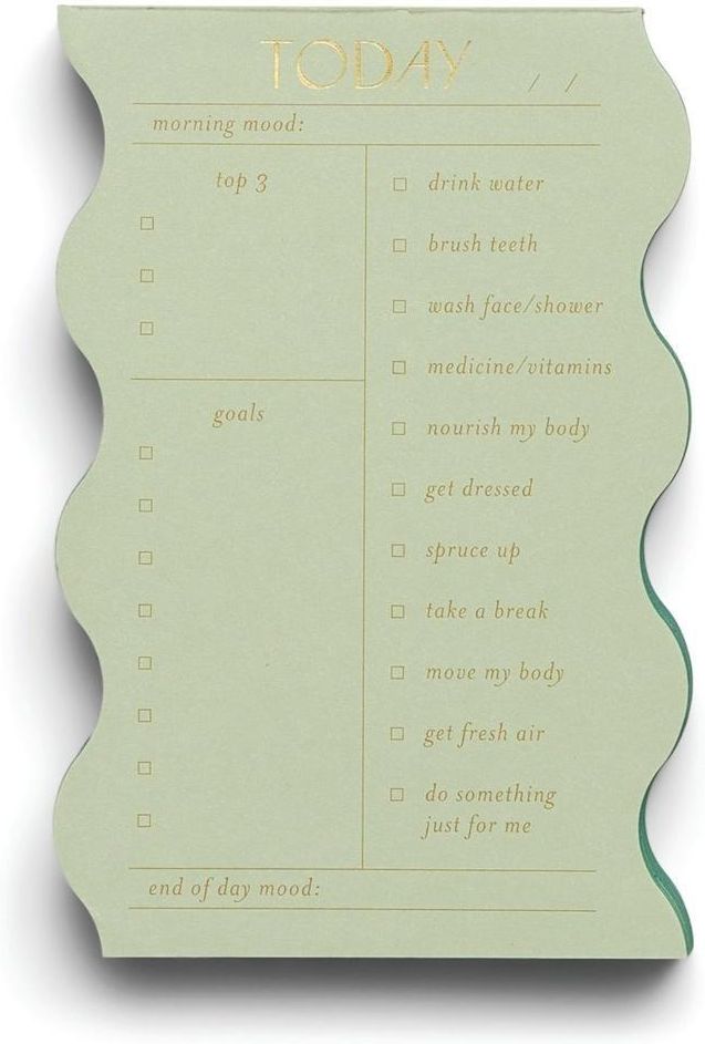 Wavy Daily Notepad Sage | DESIGNWORKS INK Robienie notatek właśnie stało się przyjemniejsze! Nowoczesne i wydajne? Sprawdź! Z eleganckim, falistym wzorem i specjalnie sformatowanymi stronami śledzenie codziennych celów to bajka. Nasz notatnik w kształcie fal zawiera ręcznie grafikę ze złotej folii, …