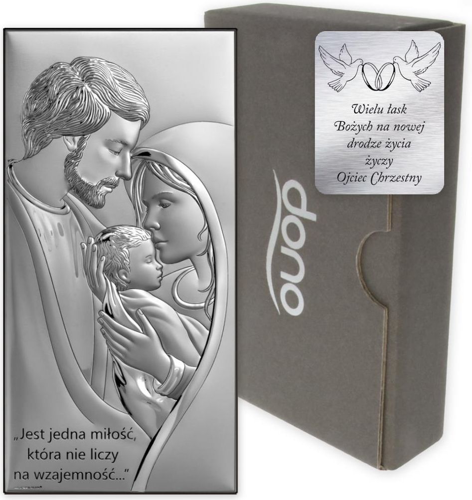 Obrazek srebrny Święta Rodzina. Postawiony lub zawieszony w pomieszczeniu ozdobi każde wnętrze. Z przodu obrazka został fabrycznie wygrawerowany napis: "Jest jedna miłość, która nie liczy na wzajemność...". Obrazek wyprodukowany został przez firmę Dono. Gwarantuje ona, iż przedmiot nabyty przez Państwa został wyprodukowany we Włoszech, zgodnie z kunsztem i tradycją obróbki metali szlachetnych. Obrazek wykonany jest z blachy aluminium pokrytej warstwą srebra. Całość zabezpieczona jest warstwą lakieru, która chroni przed czynnikami zewnętrznymi. Wpływa to na bezproblemowe użytkowanie bez potrzeby częstego czyszczenia. Obrazek z wizerunkiem Świętej Rodziny można zarówno powiesić, jak i postawić na dołączonej podstawce. Do czyszczenia zalecamy używanie wyłącznie czystych, miękkich ściereczek, a w przypadku zabrudzeń letniej wody. Nie należy stosować detergentów, alkoholu ani znajdujących się w sprzedaży środków i ściereczek do czyszczenia srebra, gdyż mogą one uszkodzić warstwę ochronną. Obrazek srebrny z wizerunkiem Świętej Rodziny to obraz zjednoczenia (komunii) Świętych Osób. Jednocześnie obraz ten wyraża zjednoczenie, miłość, życie małżeństwa i rodziny chrześcijańskiej, która dąży do świętości i do tworzenia komunii we własnym małżeństwie i rodzinie, dzięki czemu jest to doskonały prezent na ślub czy narodziny dziecka.