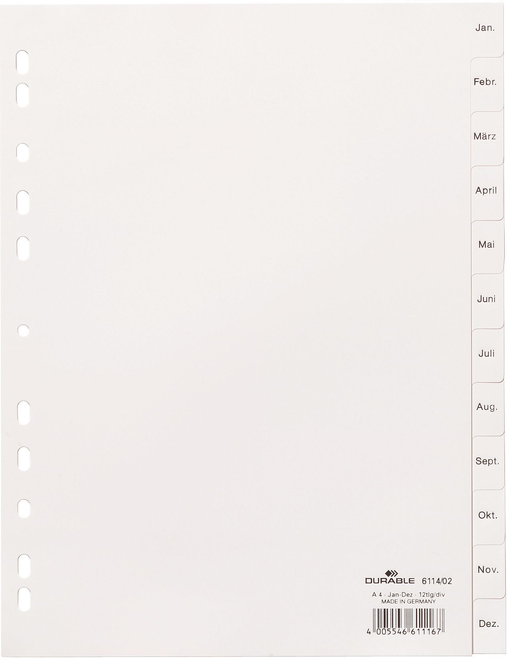 Miesięczny plastikowy rejestr z okładką- wykonany z PP- w pełni pokrywający- o wysokiej odporności na rozdarcie- odporny na brud i wilgoć- Rejestr z wytłoczonymi zakładkami do wizualnego podziału- Grubość: 0,12 mm- Wymiary: 230 x 297 mmPrzykłady zastosowań:- do teczek i segregatorów Rejestr PP ostemplowany styczeń-grudzień DURABLE Hunke und Jochheim GmbH & Co. KG Westfalenstraße 77-79, 58636 Iserlohn Indeks miesięczny z wytłoczonymi zakładkami. Z okładką do etykietowania komputerowego - Rejestr z wytłoczonymi zakładkami do podziału na miesiące - Tłoczenie zakładek: Jan.-Dec. - Podziałka/arkusz: 12 - Uniwersalna perforacja - Wykonany z PP - Okładka do etykietowania EDP do profesjonalnego etykietowania za pomocą DURAPRINT® - Dla formatu: Pełna okładka dla DIN A4 portret - Wymiary: 297 x 215/230 mm Z wytłoczonymi zakładkami. Okładka do etykietowania komputerowego do profesjonalnego etykietowania za pomocą DURAPRINT®.
