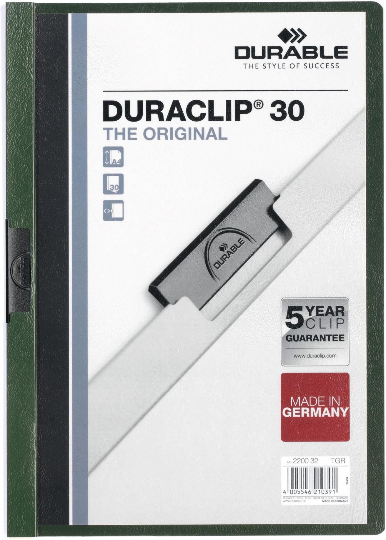 Skoroszyt zaciskowy formatu A4 z kolekcji Duraclip wykonany z trwałego PVC zacisk ze specjalnej stali posiada 5-letnią gwarancję przednia okładka jest transparentna, natomiast tylna ciemnozielona mieści do 30 kartek zaletą zacisku jest to, że nie ma konieczności dziurkowania dokumentów skoroszyt jest doskonałym narzędziem pomocniczym dla prezentacji, materiałów szkoleniowych, opinii itp., a także dla porządkowania i przechowywania ofert, raportów i innych dokumentów kolor ciemnozielony