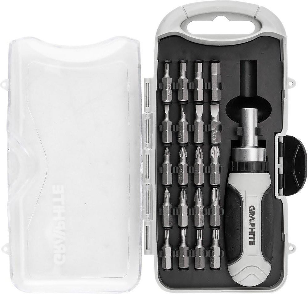 Zestaw bitów z uchwytem magnetycznym z grzechotką 115 mm, 21 szt. 56T560 marki GRAPHITE składa się z 21 elementów, w tym bitów o długości 25 mm: SL3, SL4, SL5, SL6; PH0, PH1, PH2, PH3; PZ0, PZ1, PZ2, PZ3; H3, H4, H5, H6 oraz T10, T15, T20, T25. W zestawie znajduje się także uchwyt magnetyczny z grzechotką o długości 115 mm. Uchwyt wyposażony jest dodatkowo w ergonomiczną rączkę dwukomponentową, zapewniającą wygodę oraz pewny chwyt podczas pracy. Zestaw bitów z uchwytem magnetycznym i grzechotką od marki GRAPHITE to uniwersalne rozwiązanie na wiele wyzwań dla majsterkowiczów....