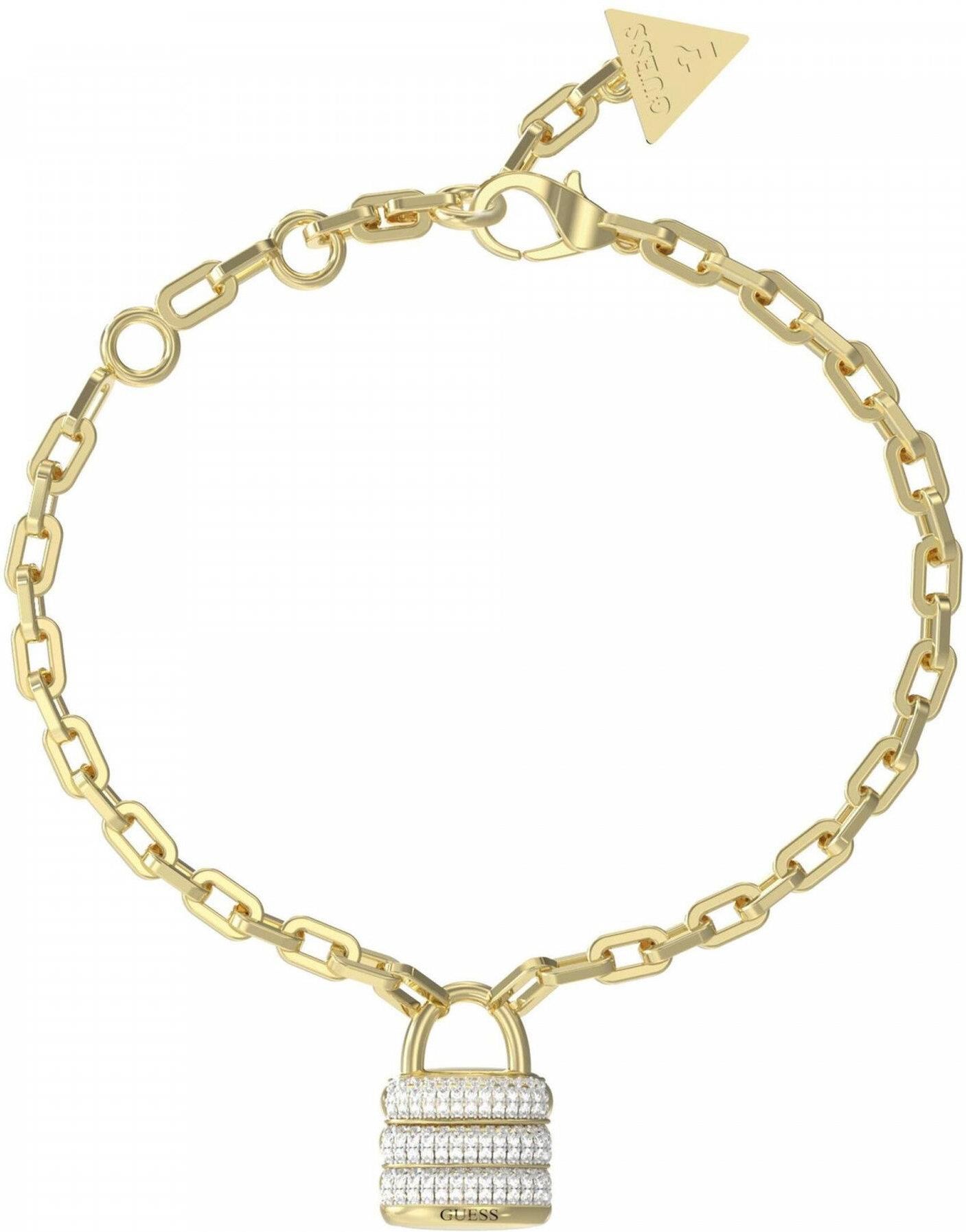 Damska błyszcząca platerowana pozłacana stalowa bransoletka Guess z kolekcji My Secret. Złocenie w kolorze żółtego złota. Zdobiona cyrkoniami zawieszka w kształcie kłódki. Regulowana długość.