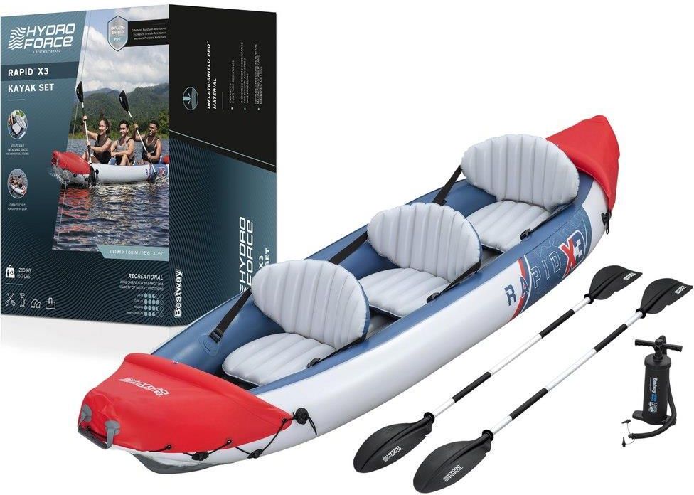 KAJAK DMUCHANY RAPID X3 3-osobowy zestaw z pompką, wiosłami i torbą | ✅ 381 × 100 cm | ✅ Wytrzymały Inflata-Shield™ | ✅ Do jeziora, rzeki i relaksu na wodzie GOTOWY NA WODNĄ PRZYGODĘ? Kajak Bestway Rapid X3 to idealne rozwiązanie dla wszystkich, którzy marzą o komfortowej i bezpiecznej przygodzie …