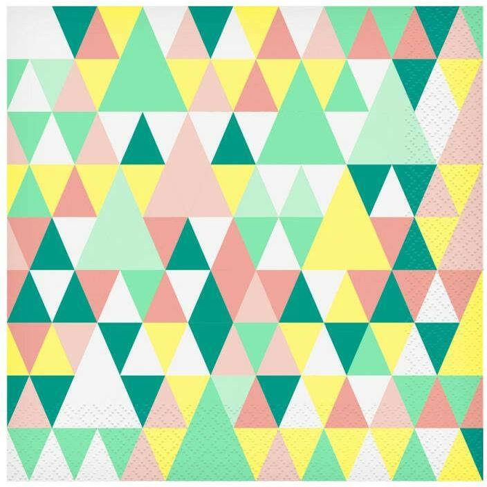 Serwetki mają nowoczesny, geometryczny wzór złożony z kolorowych trójkątów w pastelowych odcieniach. Dominujące barwy to miętowa zieleń, pudrowy róż, kremowy, jasny żółty i turkusowy, które tworzą żywą i harmonijną mozaikę. Wzór przypomina stylizowane, minimalistyczne choinki, co dodaje serwetkom …