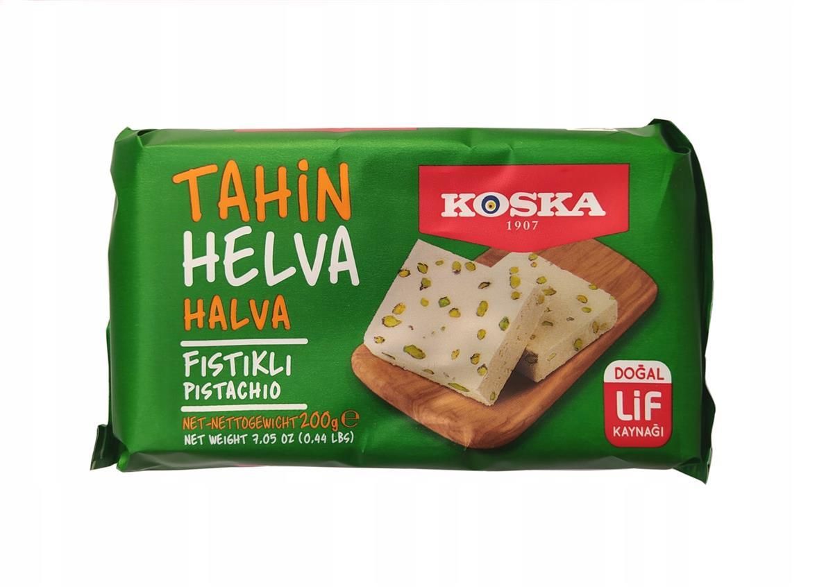 KOSKA Tahin Helva z pistacjami waga netto 200 g Chałwa sezamowa KOSKA to turecka chałwa, znana i ceniona na całym świecie. Gwarancja wyśmienitego smaku i bardzo wysokiej jakości. Skład: pasta sezamowa 57%, cukier, orzechy pistacjowe 8%, emulgator (mono i diglicerydy), wyciąg z korzenia mydlnicy, …