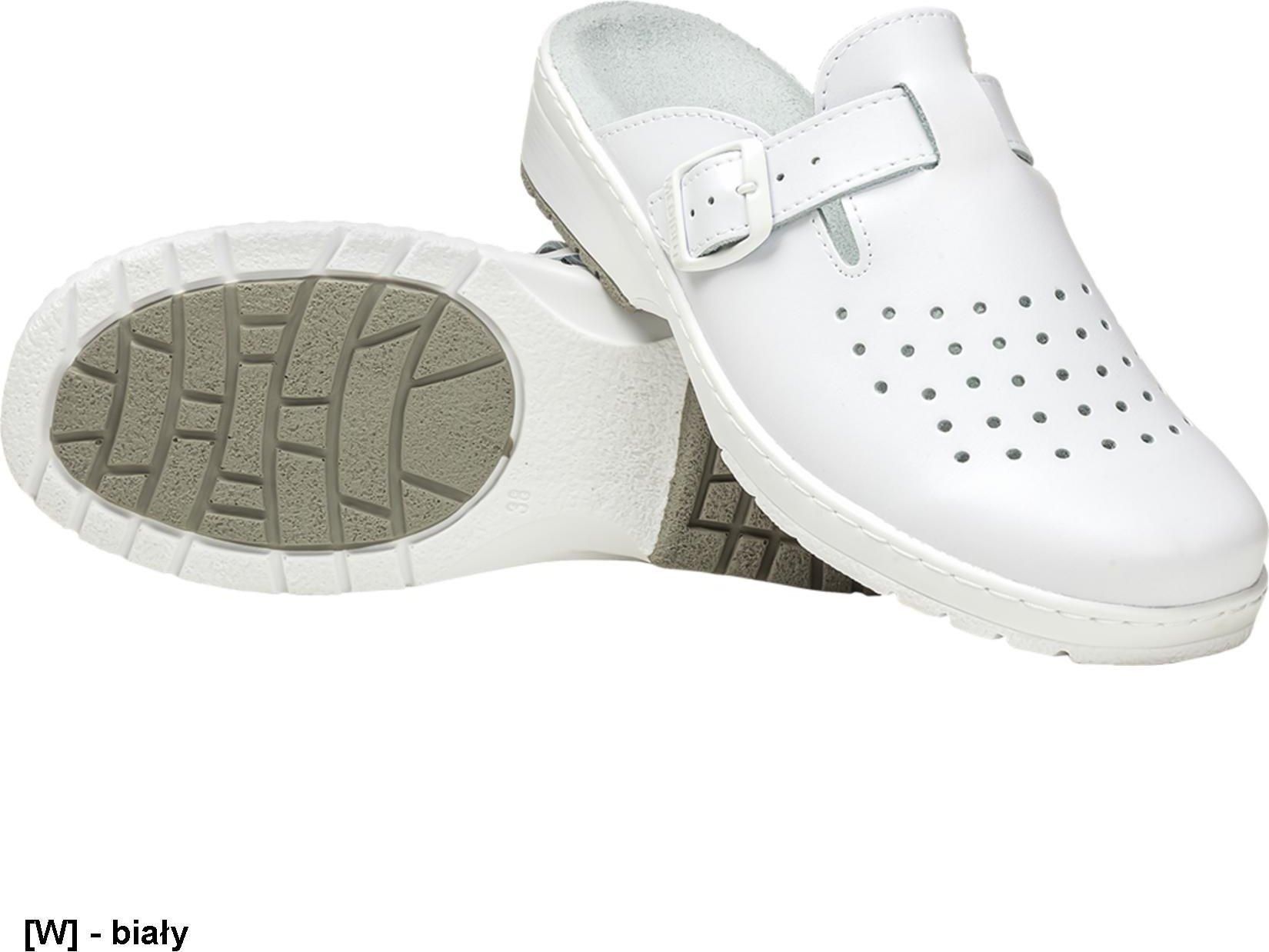 BMKLADZWK Klapki profilaktyczne damskie. wierzch z naturalnej miękkiej skóry perforowany z paskiem do regulacji tęgości podbicia. Wymienna wkładka, ze skóry naturalnej, anatomiczna, antystatyczna impregnowana środkiem bakteriobójczym, z pełnym profilem ortopedycznym ułatwiająca utrzymanie w czystości z możliwością dokupienia zapasowej. Podeszwa wykonana z lekkiego i elastycznego PU o właściwościach antypoślizgowych i antystatycznych z głębokim bieżnikiem antypoślizgowym. Montaż klejony i dodatkowe szycie wzmacniające na obwodzie. Spełniają wymagania normy EN20347. Marka: MEDIBUT Produkt polecany dla branż: Przemysł spożywczy w tym obsługa restauracji oraz służby zdrowia i lecznictwa