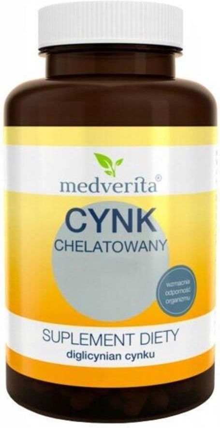 Medverita Cynk Chelatowany 15mg 180 kapsułek Cynk to pierwiastek zaliczany do niezbędnych mikroelementów, które muszą być dostarczane w pożywieniu. Uczestniczy w wielu przemianach i procesach biochemicznych w organizmie człowieka. Naturalnymi źródłami cynku są: chude mięso, rośliny strączkowe, pieczywo pełnoziarniste, orzechy i ryby.Preparat zawiera chelat aminokwasowy cynku (diglicynian cynku). Właściwości cynku: pomaga w prawidłowym funkcjonowaniu układu odpornościowego pomaga zachować zdrową skórę, włosy i paznokcie pomaga w prawidłowej syntezie białka pomaga w ochronie komórek przed stresem oksydacyjnym pomaga w utrzymaniu zdrowych kości pomaga w utrzymaniu prawidłowych funkcji poznawczych pomaga w utrzymaniu prawidłowej płodności i prawidłowych funkcji rozrodczych pomaga w utrzymaniu prawidłowego poziomu testosteronu we krwi bierze udział w procesie podziału komórek pomaga w prawidłowej syntezie DNA przyczynia się do utrzymania prawidłowego metabolizmu kwasów tłuszczowych pomaga w utrzymaniu prawidłowej równowagi kwasowo-zasadowej pomaga w utrzymaniu prawidłowego widzenia przyczynia się do utrzymania prawidłowego metabolizmu witaminy A pomaga w utrzymaniu prawidłowego metabolizmu węglowodanów przyczynia się do utrzymania prawidłowego metabolizmu makroskładników odżywczych przyczynia się do prawidłowego funkcjonowania układu odpornościowego Składniki: cynk (diglicynian cynku), inulina (korzeń cykorii), żelatyna (otoczka kapsułki). W skład preparatu wchodzi także inulina z korzenia cykorii, która pełni rolę naturalnego stabilizatora w kapsułce. Inulina zaliczana jest do prebiotyków. Suplement diety nie zawiera zbędnych: substancji wypełniających, adsorbentów, substancji wiążących, konserwantów, substancji powlekających, substancji poślizgowych. Zawartość netto: 180 kapsułek / 71,1 gMasa kapsułki: 395 mgPorcja zalecana do spożycia w ciągu dnia: 1 kapsułka dziennie, najlepiej w trakcie posiłku. Porcja dzienna zawiera: diglicynian cynku - 75 mgw tym cynk - 15 mg (150% RWS*)*- referencyjna wartość spożycia Uwagi: nie należy przekraczać zalecanej dziennej porcji. Przechowywać w sposób niedostępny dla małych dzieci. Suplement diety nie może być stosowany jako substytut zróżnicowanej diety. Utrzymanie prawidłowego stanu zdrowia wymaga zrównoważonego odżywiania i prowadzenia zdrowego trybu życia. Przechowywanie: w temperaturze poniżej 25°C, w oryginalnym opakowaniu w celu ochrony przed światłem i wilgocią. Producent: Medverita Group Paulina Schroeder ul. Smolki 5/LU5 Kraków 30-513
