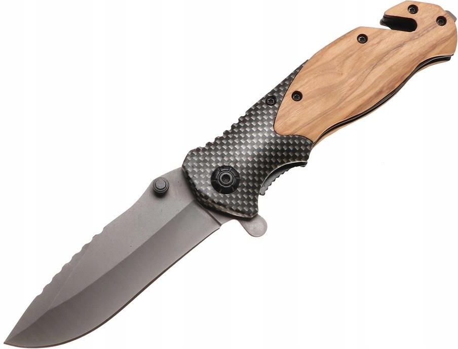 Nóż składany Głownia typu Drop point utwardza sztych dzięki czemu nóż bardzo dobrze tnie. Idealny nóż myśliwski, ale również roboczy Cechy produktu: Nóż wykonany z wysokiej jakości stali Stalowy uchwyt z nakładkami z drewna Klips umożliwia zapięcie na pasek Od spodu dodatkowe ostrze do przecinania oraz zbijak do szyb Rękojeść typu Frame lock Bardzo ostry Wygodnie leży w dłoni Scyzoryk składany Bardzo solidne wykonanie Długość ostrza: 8,5 cm Długość noża: 20,5 cm Długość noża złożonego: 12 cm