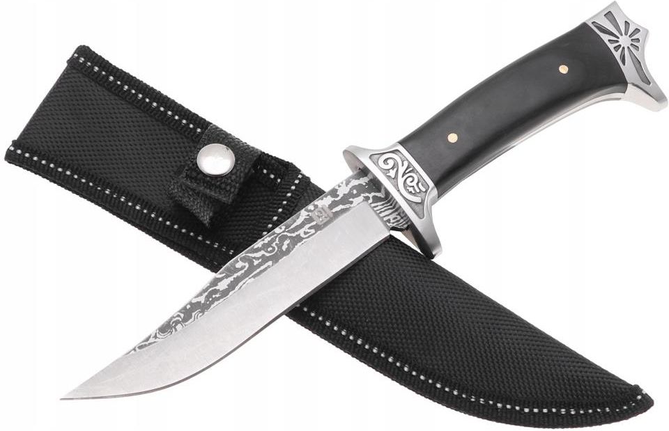 Nóż myśliwski z pokrowcem Głownia typu Clip point charakteryzuje się dobrą przebijalnością oraz dobrze sprawdza się przy precyzyjnych zadaniach Cechy produktu: Nóż wykonany z wysokiej jakości stali Bardzo ostry Wygodnie leży w dłoni Konstrukcja z pełnym trzpieniem (full tang) Nakładki rękojeści z twardegodrewna mocowane na 2 skręcane piny Jelec chroni przed ześlizgnięciem się dłoni Długość ostrza: 12 cm Długość noża: 24 cm W zestawie materiałowy pokrowiec