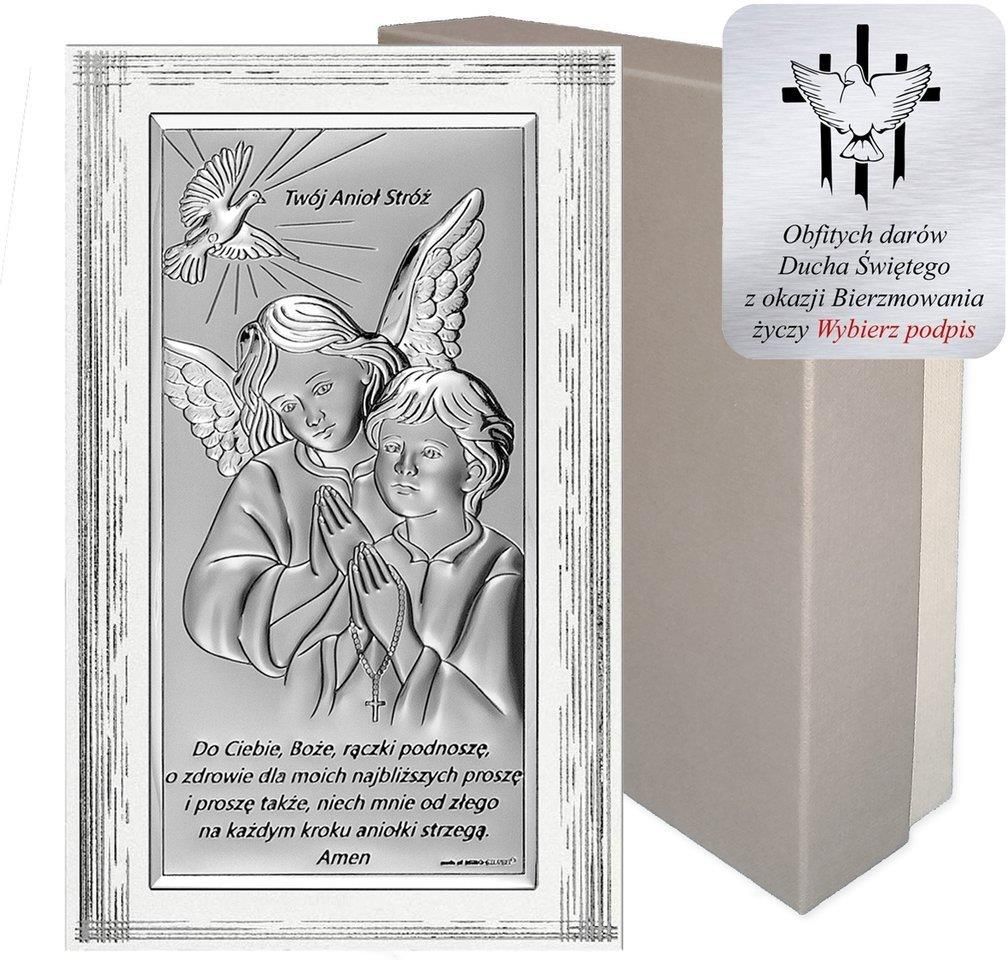 Obrazek srebrny Aniołek modlący się z dzieciątkiem, z wygrawerowanym tekstem modlitwy: "Do Ciebie Boże, rączki podnoszę, o zdrowie dla moich najbliższych proszę i proszę także, niech mnie od złego na każdym kroku aniołki strzegą. Amen" oraz napisem "Twój Anioł Stróż". Obrazek z wizerunkiem modlącego się Aniołka, czuwającego nad dzieckiem, stanowi idealny prezent z okazji Chrztu Świętego lub Bierzmowania ze względu na obecność Ducha Świętego. Obrazek wyprodukowany został przez firmę Beltrami. Gwarantuje ona, iż przedmiot nabyty przez Państwa został wyprodukowany we Włoszech, zgodnie z kunsztem i tradycją obróbki metali szlachetnych. Do produkcji wykorzystano innowacyjny metal szlachetny o nazwie MIRO-SILVER, opatentowany na terytorium całej Europy. Jest to nowoczesny surowiec pokryty w procesie atomowym warstwą czystego srebra 999,95. Otrzymany drogocenny metal posiada wyjątkowe cechy, przewyższając jakością materiały pozyskiwane metodami tradycyjnymi. Jest odporniejszy na odkształcenia mechaniczne i śniedzenie, doskonale odbija światło, co podkreśla szlachetność srebra. Obrazek zabezpieczony jest warstwą lakieru, która chroni przed czynnikami zewnętrznymi. Wpływa to na bezproblemowe użytkowanie bez potrzeby częstego czyszczenia. Obrazek można zarówno powiesić, jak i postawić na dołączonej podstawce. Do czyszczenia zalecamy używanie wyłącznie czystych, miękkich ściereczek, a w przypadku zabrudzeń letniej wody. Nie należy stosować detergentów, alkoholu ani znajdujących się w sprzedaży środków i ściereczek do czyszczenia srebra, gdyż mogą one uszkodzić warstwę ochronną.
