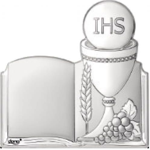 Obrazek srebrny przedstawiający otwartą księgę oraz kielich z Hostią. Obrazek wyprodukowany został przez firmę Dono. Gwarantuje ona, iż przedmiot nabyty przez Państwa został wyprodukowany we Włoszech, zgodnie z kunsztem i tradycją obróbki metali szlachetnych. Obrazek wykonany jest z blachy aluminium pokrytej warstwą srebra. Całość zabezpieczona jest warstwą lakieru, która chroni przed czynnikami zewnętrznymi. Wpływa to na bezproblemowe użytkowanie bez potrzeby częstego czyszczenia. Obrazek można zarówno powiesić, jak i postawić na dołączonej podstawce. Do czyszczenia zalecamy używanie wyłącznie czystych, miękkich ściereczek, a w przypadku zabrudzeń letniej wody. Nie należy stosować detergentów, alkoholu ani znajdujących się w sprzedaży środków i ściereczek do czyszczenia srebra, gdyż mogą one uszkodzić warstwę ochronną. Obrazek Pamiątka I Komunii Świętej stanowi idealny prezent okolicznościowy, który powinien znaleźć się w każdym domu.