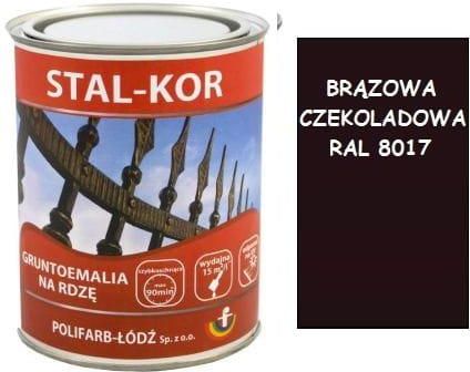 STAL-KOR Gruntoemalia na rdzę POLIFARB-ŁÓDŹ Pojemność: 10L Kolor: BRĄZ CZEKOLADA STAL-KOR GRUNTOEMALIA NA RDZĘ BEZ GRUNTOWANIA Stal-Kor Gruntoemalia na rdzę jest produktem lakierowym, rozpuszczalnikowym, jednoskładnikowym, kryjącym i szybko wysychającym na powietrzu. Zawiera aktywne pigmenty antykorozyjne oraz dodatki reaktywne. Wydajność: (30 ÷ 40 µm) - 11 ÷ 15 m²/dm³ Przeznaczenie: do stosowania samodzielnego – nie wymaga gruntowania, do bezpośredniego i renowacyjnego malowania podłoży stalowych i żeliwnych, dla ochrony antykorozyjnej i w celu dekoracyjnym (np. konstrukcje w budownictwie i przemyśle, ogrodzenia, barierki, wiaty, maszyny, w tym maszyny rolnicze, urządzenia itp.), do stosowania na podłoża niedoczyszczone z korozji Stal-Kor gruntoemalia na rdzę – właściwości powłoki półmatowa, dobrze przyczepna do podłoża, kryjąca, o doskonałych właściwościach ochronnych, twarda, elastyczna, odporna na uderzenia, uszkodzenia mechaniczne, wilgoć, czynniki atmosferyczne (woda, UV), bardzo szybko wysychająca. Ze względu na zawartość pigmentów antykorozyjnych i dodatków reaktywnych, powłoka farby dobrze chroni stopy żelaza przed korozją i hamuje dalszy jej rozwój. Dla dodatkowej ochrony w miejscach korozji można zastosować preparat odrdzewiający TOP-KOR.