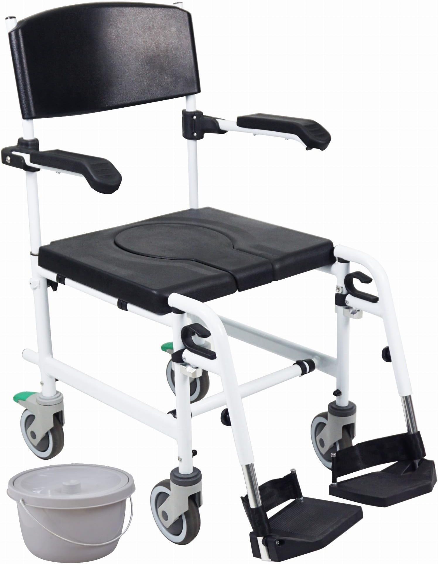 MASTER-TIM PLUS - Prysznicowo-toaletowy wózek transportowy Opis produktu Prysznicowo-toaletowy wózek transportowy MASTER-TIM PLUS - Prysznicowo-toaletowy wózek transportowy jest sprzętem pomocniczym dla osób mających problemy z samodzielnym poruszaniem się oraz dla osób z dysfunkcjami i ograniczeniami ruchowymi. Przeznaczony do korzystania wewnątrz pomieszczeń. Może być obsługiwany tylko przy pomocy osoby towarzyszącej. Wózek pełni funkcję prysznicową, transportową i toaletową dzięki wyposażeniu w pojemnik sanitarny pod siedziskiem i cztery obrotowe koła. Ma na celu ułatwienie czynności higienicznych i fizjologicznych użytkownika. Szczególnie zalecany dla osób mających problemy z poruszaniem się wywołane przez: paraliż, nadwagę, zwyrodnienia lub deformację kończyn, zwyrodnienia czy uszkodzenia stawów, uszkodzenie kończyn lub ich amputacje, choroby serca i naczyń, zaburzenia krążenia. Cechy produktu: Wózek wykonany jest z aluminiowej, malowanej proszkowo ramy, posiada uchylne podłokietniki umożliwiające łatwe wsiadanie i zsiadanie osobom o obniżonej sprawności ruchowej, wózek ma regulację kąta nachylenia siedziska z oparciem, wyposażony jest w siedzisko z klinem wykonane z PU, posiada zagłówek, ma cztery obrotowe koła 5” z hamulcami, uchylne podnóżki i pojemnik sanitarny, konstrukcja wózka umożliwia najeżdżanie na sedes. Dane techniczne Szerokość całkowita: 54 cm Szerokość wewnętrzna: 46 cm Głębokość całkowita: 106 cm Wysokość siedziska od podłoża: 55-61 cm Wysokość całkowita: 115-136 cm Wymiary siedziska: 44 x 44 cm Waga: 13 kg Maksymalne obciążenie: 150 kg Regulacja nachylenia: maks. 30