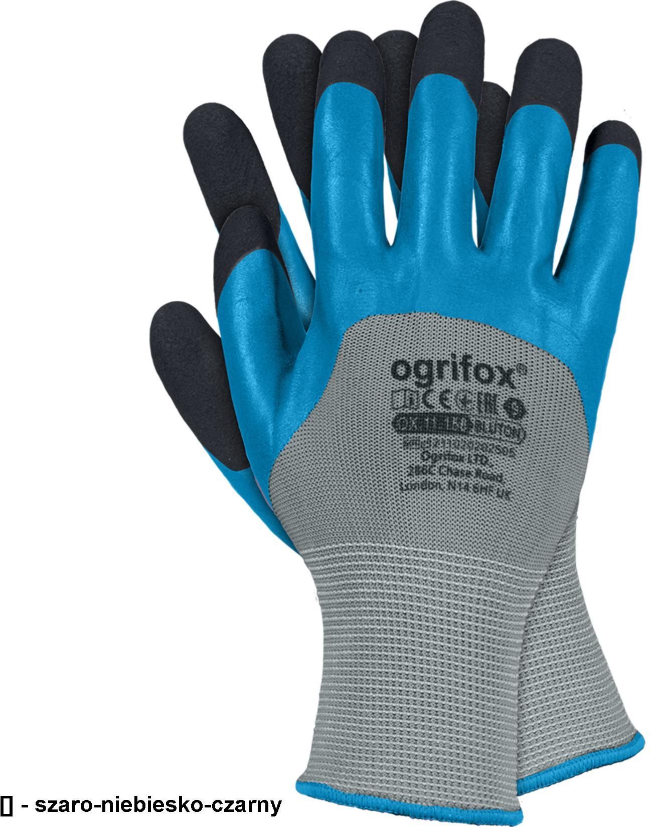 OX-BLUTON Rękawice ochronne, dziane. 100% poliester (ścieg 13). W części chwytnej i do połowy w części wierzchniej powlekane niebieskim lateksem typu FOAM. Dodatkowe powleczenie czarnym lateksem typu FOAM na końcówkach palców. Zakończone ściągaczem. Od wewnątrz wysokiej jakości dzianina poliestrowa, która gwarantuje komfort użytkowania. Wytrzymałość i wysoka jakość gwarantują zadowolenie użytkowników. Wykorzystywane w budownictwie oraz przemyśle transportowym. Marka: OGRIFOX Rękawice sprzedawane są w pełnych kartonach - cena podana jest za jedną parę rękawic.