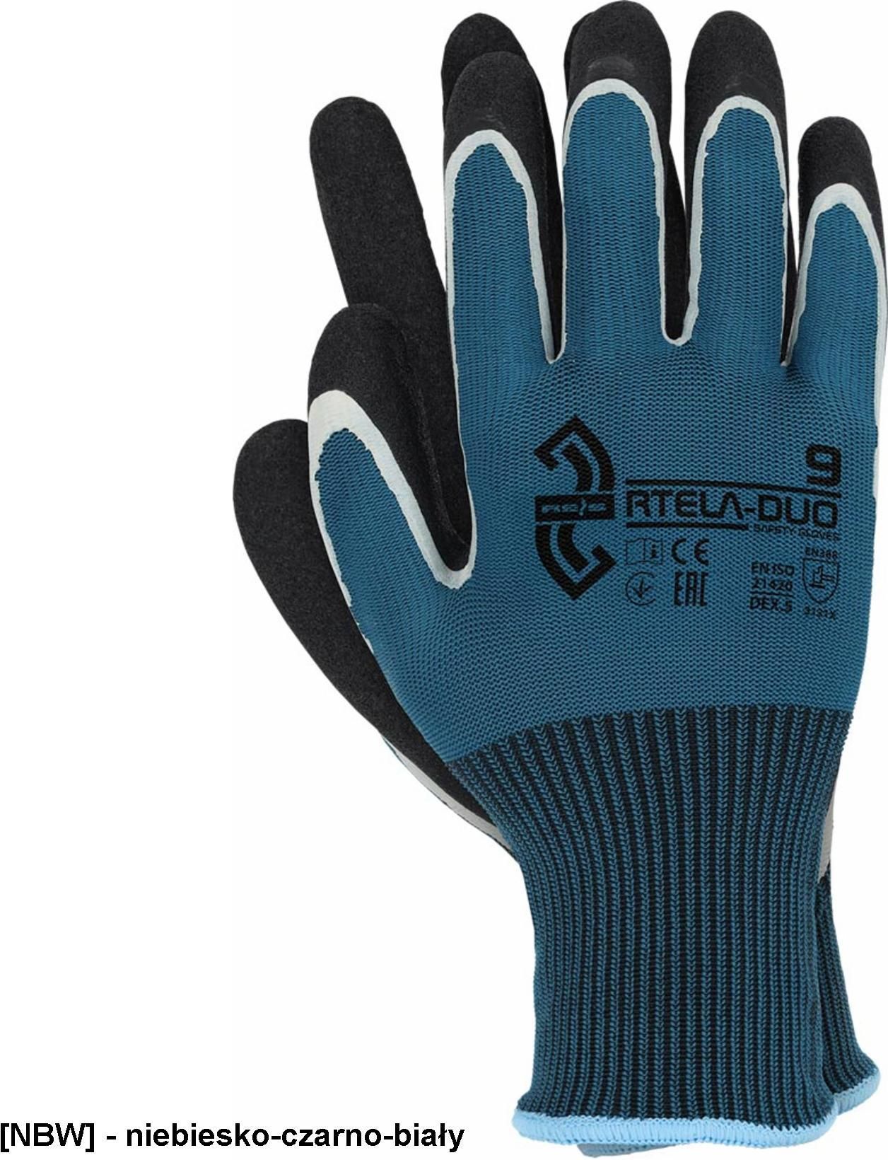RTELA-DUO Rękawice ochronne. dzianina: 100% poliester (ścieg 13). Powlekane podwójnie lateksem, pierwsza warstwa typu smooth, druga lateks o chropowatej strukturze zapewniającej doskonałą chwytność, nie powodując usztywnienia rękawicy. Zakończone ściągaczem. Odporne na ścieranie i rozdarcie. Rozciągliwe i wytrzymałe, mimo iż są cienkie. Zapewniają manualność oraz doskonałe czucie trzymanego przedmiotu. Wykazują bardzo dużą elastyczność oraz świetnie dopasowują się do dłoni. Marka: REIS