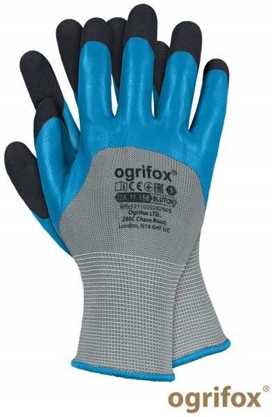OX-BLUTON Rękawice ochronne, dziane. 100% poliester (ścieg 13). W części chwytnej i do połowy w części wierzchniej powlekane niebieskim lateksem typu FOAM. Dodatkowe powleczenie czarnym lateksem typu FOAM na końcówkach palców. Zakończone ściągaczem. Od wewnątrz wysokiej jakości dzianina poliestrowa, która gwarantuje komfort użytkowania. Wytrzymałość i wysoka jakość gwarantują zadowolenie użytkowników. Wykorzystywane w budownictwie oraz przemyśle transportowym. Marka: OGRIFOX Rękawice sprzedawane są w pełnych kartonach - cena podana jest za jedną parę rękawic.