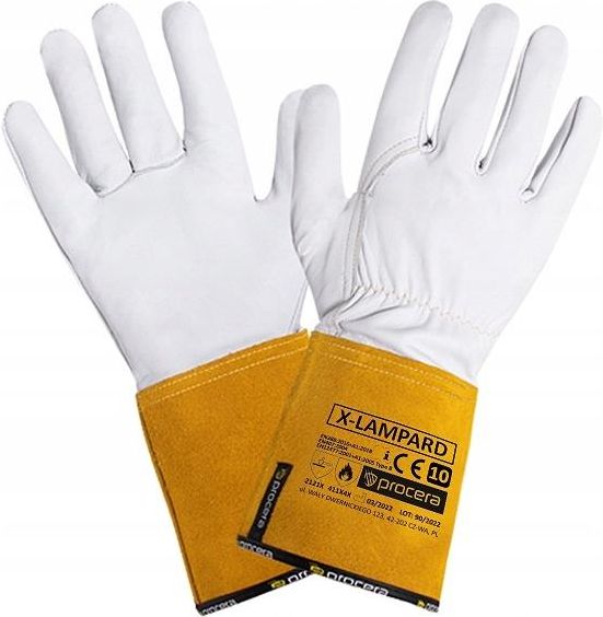 Rękawice ochronne spawalnicze X-LAMPARD wykonane w części chwytnej i wierzchniej z licowanej skóry koziej najwyższej jakości: Posiadają długi mankiet ze skóry dwoinowej. Są szyte trudnopalnymi nićmi kevlarowymi. Ze ściągaczem w części wierzchniej na wysokości nadgarstka co wzmacnia komfort i dopasowanie. Kat. II, EN388:2016+A1:2018, EN:407:2004, EN:12477:2001+A1:2005 Długość 35cm. Kolor: biały/złoty. Aukcja dotyczy 1 pary rękawiczek w rozmiarze 11. Dostępne rozmiary: 10, 11.