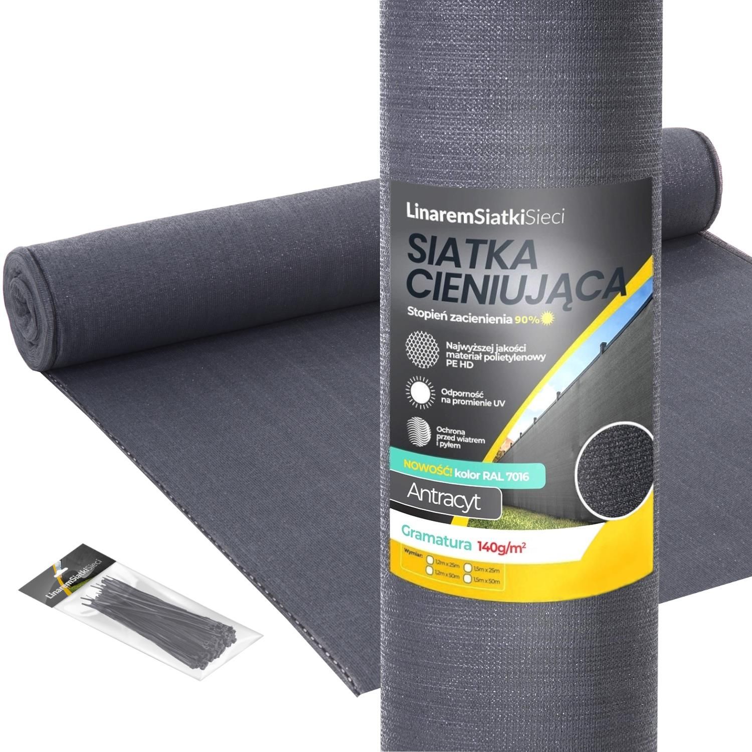 SIATKA CIENIUJĄCA LINAREM SIATKISIECI 140g/m2 W ROLCE 1,2x25m UWAGA - REALIZACJA ZAMÓWIEŃ NA SIATKĘ OD 22 KWIETNIA Gramatura materiału 140g/m2 - najwyższa gęstość siatki w segmencie 90% zacienienia. Proszę nie dać się oszukać przez sztucznie zawyżone parametry. Zalecamy sprawdzać gramaturę i faktyczną wagę rolki. Więcej informacji dotyczących gramatury znajdą Państwo w opisie oferty. Materiał najwyższej jakości 100% 'virgin' PEHD - bez domieszek materiału z recyklingu Zastosowanie stabilizacji UV+ - siatka dłużej posłuży przy ekspozycji na słońce Atestowana - produkt z atestem Narodowego Instytutu Zdrowia Publicznego PZH-PIB Specyfikacja siatki cieniującej 140g/m2 Wymiar rolek: 1,2m x 25mb Siatki wysyłane w pełnowymiarowych rolkach bez składania na pół (składanie siatki może tworzyć trwałe zagięcia) Kolor: grafit/antracyt Gramatura 140g/m2 - stopień zacienienia 90% - bez sztucznego zawyżania Materiał PEHD: 100% nowy materiał polietylenowy o podwyższonej gęstości (bez dodatków materiału z recyklingu) Ochrona materiału UV - zastosowanie stabilizatorów UV z dodatkową powłoką ochronną Oczka montażowe - wzdłuż górnej i dolnej krawędzi Dodatkowe przeszycie polipropylenowe - wzdłuż oczek montażowych dodatkowo chroniące miejsca montażu przed zerwaniem (czarne przeszycie na brzegach widoczne na zdjęciach rolki) Przystosowana do użytkowania na zewnątrz W zestawie mocniejsze opaski zaciskowe 4 mm x 150 mm (100 szt.) Siatka na ogrodzenie w najmodniejszym kolorze antracytowym / grafitowym Tylko u nas kupisz siatkę cieniującą w najpopularniejszym kolorze grafit / antracyt RAL 7016. Modny grafitowy kolor zwiększa uniwersalność i funkcjonalność siatki i sprawia, że możesz ją wykorzystać zarówno do: zamaskowania nowego ogrodzenia z siatki ogrodzeniowej lub paneli; osłony balkonu lub tarasu; szybkiego odnowienia wyglądu starego i zniszczonego płotu. Siatkę zamontujesz na ogrodzeniu o wysokości 1,5 m. W przypadku niższego lub wyższego płotu polecamy siatki o innych wysokościach z naszych pozostałych ofert. Postaw na jakość materiału w wersji Premium Ciesz się wieloletnia trwałością i odpornością UV Siatka cieniująca 90% wykonana jest z najwyższej jakości nowego 100% polietylenu PEHD - gęsto plecionego; Na dolnej i górnej krawędzi znajdziesz oczka ułatwiające montaż siatki do ogrodzenia; Zastosowanie na całej długości (góra/dół) czarnego przeszycia polipropylenowego wzmacniającego miejsca montażowe; Zawarte w siatce stabilizatory UV PROTECT+ umożliwiają wieloletnią eksploatację, chroniąc materiał przed osłabieniem struktury, blaknięciem czy kruszeniem; Atest Narodowego Instytutu Zdrowia Publicznego PZH-PIB Wszystkie siatki cieniujące 140g Linarem SiatkiSieci zostały sprawdzone pod względem składu (w tym dodatkowych stabilizatorów UV) oraz posiadają atest NIZP PZH - PIB (Narodowego Instytutu Zdrowia Publicznego PZH - Państwowego Instytutu Badawczego). Numer atestu: B.BK.60111.0019.2022 Ważność atestu: 14.03.2027 Atest posiadają rolki z nawiniętą siatką tylko w oryginalnych etykietach z logo Linarem SiatkiSieci widocznych na zdjęciach. Wybierz odpowiedni stopień zacienienia do swoich potrzeb 75-85% - używane do zacienienia szklarni/upraw oraz na ogrodzenia dla umiarkowanego zachowania prywatności, zacienienia oraz redukcji wiatru; 90% - stosowane do zacienienia upraw wymagających dużego stopnia zacienienia oraz na ogrodzenia dla zachowania wysokiego stopnia prywatności, maskowania, cienia oraz redukcji wiatru. 95% - najlepszy wybór w sytuacji, kiedy zależy Ci na maksymalnym możliwym zachowaniu prywatności bez kompromisów. Najgęstsze wersje siatek cieniujących dla najbardziej wymagających, jednocześnie zapewniające niewielki przepływ wiatru i znikomą przejrzystość. Siatki o podanych wyżej stopniach cieniowania dostępne są na naszych aukcjach! Gramatura siatki cieniującej - stopień zacienienia Gramatura siatki cieniującej oraz stopień zacienienia to jedne z najważniejszych parametrów siatki, które bardzo często są źle rozumiane przez klientów oraz manipulowane przez sprzedających w celu uzyskania odpowiedniego efektu marketingowego. Poniżej wyjaśniamy co te parametry oznaczają oraz jak wpływają na zastosowanie i jakość siatki cieniującej. 1. Gramatura - najważniejszy parametr siatki. Co oznacza ? Gramatura siatek cieniujących jest to najważniejszy parametr, który każdy klient w razie wątpliwości może sprawdzić za pomocą zwykłej wagi odcinając odpowiedni kawałek materiału. Jest to nic innego jak waga danego materiału o powierzchni jednego metra kwadratowego. Gramatura siatek cieniujących wyrażana jest w gramach na jeden metr kwadratowy (g/m2). Przykład. 'Gramatura 180g/m2' oznacza, że siatka o wysokości 1m i długości 1m powinna ważyć 180g Gramatura w największym stopniu determinuje gęstość siatki. W skrócie można przyjąć że im wyższa gramatura tym siatka jest gęstsza i zapewni nam większy stopień zacienienia / ograniczenia widoczności. 2. Stopień zacienienia - co określa? Stopień zacienienia jest to parametr umowny przyjęty do określenia jak bardzo siatka zamontowana na ogrodzeniu ogranicza widoczność. Wyrażany jest w wartościach procentowych np. 60% / 75% / 90% / 95%. Im większy procentowy stopień zacienienia siatki tym bardziej ograniczymy widoczność. Stopień zacienienia jest bezpośrednio determinowany przez gęstość siatki a tym samym gramaturę siatki. Im większa gramatura tym możemy przyjąć, że stopień zacienienia będzie większy. Istotny jest również sposób wykonania siatki w procesie produkcji jednak najczęściej parametr gramatury bezpośrednio determinuje stopień zacienienia. 3. Zawyżanie stopnia zacieniania - sprawdź gramaturę siatki. Bardzo częstym zjawiskiem w ostatnich latach jest sztuczne zawyżanie parametru stopnia zacienienia przez sprzedając