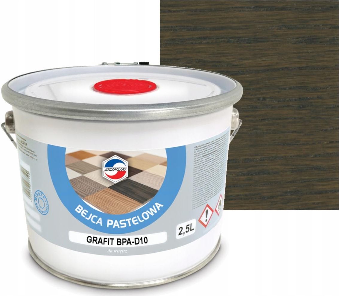 Bejca pastelowa SOPUR Szybkoschnąca, jednorodna i łatwo rozlewająca się bejca do drewna iglastego i liściastego. Czas schnięcia: ok. 15-30 minut Wydajność: ok. 10 m2/l Stosowanie: do wnętrz Pojemność: 2,5l Kolor: Grafit BPA-D10 Posiada szeroką gamę modnych, rozbielonych kolorów nawiązujących do barw natury. Produkt na bazie rozpuszczalników organicznych i pigmentów, który charakteryzuje się dobrą odpornością na światło wewnątrz pomieszczeń. Zastosowanie bejcy obejmuje dekoracyjne malowanie drewnianych i drewnopochodnych elementów meblowych, schodów i podłóg. Bejca jest dostępna w trzech liniach o różnych parametrach, w zależności od oczekiwanych efektów i potrzeb użytkownika. Przed aplikacją, drewniane powierzchnie powinny być dokładnie oczyszczone i wyszlifowane, a wyrób bejcy dokładnie wymieszany. Bejce pastelowe można nanosić natryskiem pneumatycznym lub hydrodynamicznym na różne gatunki drewna. W celu podkreślenia pór drewna, bejce o indeksach BPA i BPA-D można przetrzeć flanelą wzdłuż słojów drewna. Kolory mogą się różnić w zależności od ustawień monitora czy telefonu. Barwienie należy wykonywać w temperaturze otoczenia od 5°C do 30°C. Po aplikacji, barwione elementy należy suszyć w temperaturze 20°C przez około 15-30 minut. Powierzchnie wybarwione należy pokryć warstwą nawierzchniową o wysokiej odporności na promienie UV, zgodnie z instrukcją jej stosowania. Warto jednak pamiętać, że kolory wyświetlane na monitorze lub telefonie mogą się nieznacznie różnić od rzeczywistych odcieni bejcy. UWAGA! Ze względu na gęsty pigment, przed jak i w trakcie aplikacji, bejce należ starannie wymieszać mechanicznie!