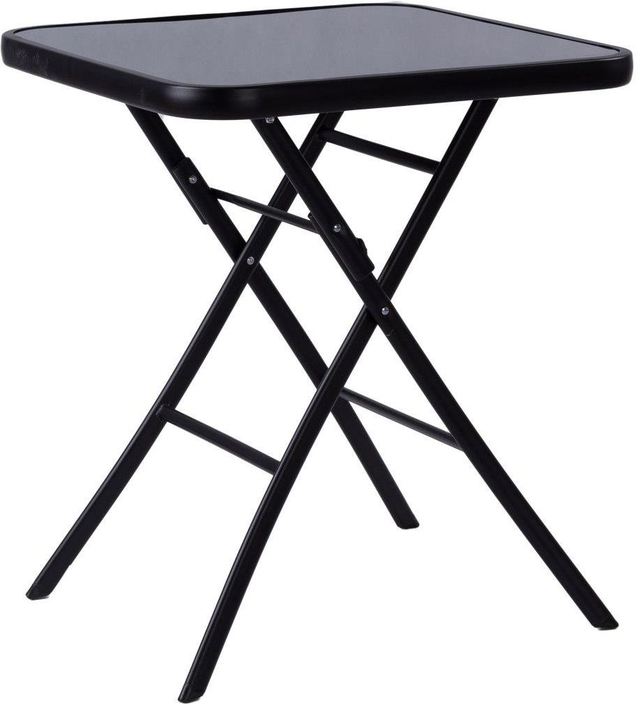 SKŁADANY STOLIK Idealny do ogrodu lub na taras Szklany, czarny, hartowany blat o wymiarze 60x60 cm Stabilna konstrukcja z możliwością złożenia Stalowe profile malowane proszkowo Odporny na warunki atmosferyczne Antypoślizgowe stopki Łatwy w utrzymaniu czystości Estetyczne połączenie czarnego koloru …