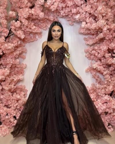 Zjawiskowa długa sukienka tiulowa. Góra sukienki dobrze dopasowana gorsetowa, ozdobiona przepiękną koronką i cekinami Wszyte miseczki pozwalają na nie zakładanie biustonosza. Cienkie ramiączka, oraz opadające na ramiona koronkowe rękawki które można odpiąć, tył sznurowany i zapinany na zamek. Dół …