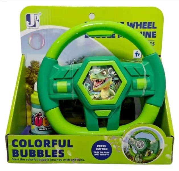 Kierownica do baniek mydlanych z motywem dinozaura i płynem do baniek. Zabawka z efektem świetlnym. Produkt działa na baterie typu AA. Baterie nie są załączone do zabawki. Kierownica zapakowana w kartonowe pudełko. Podane wymiary są wymiarami opakowania. Zabawka przeznaczona dla dzieci od 3 lat. Wiek: 3+