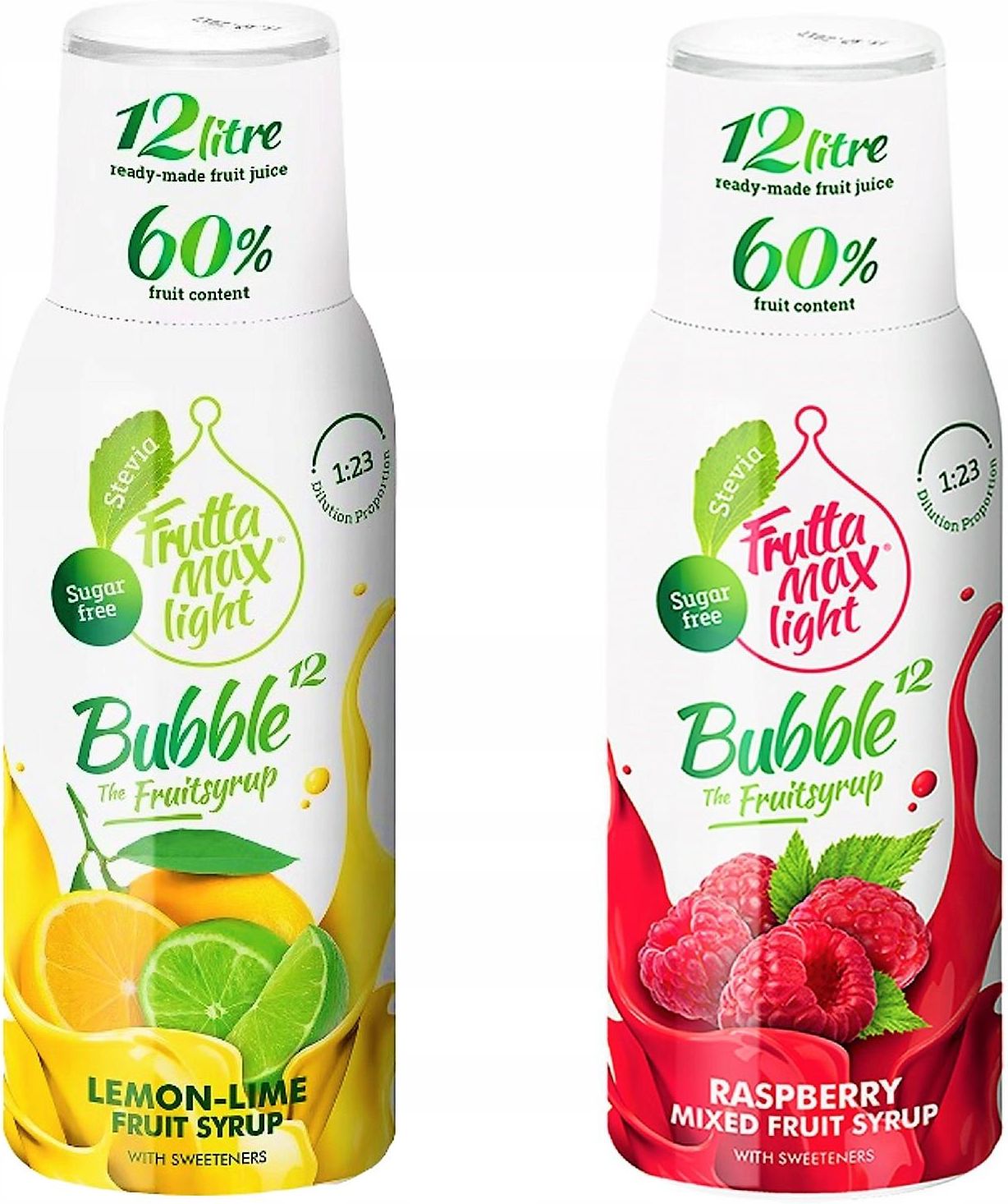 Syropy FruttaMax 500 ml FruttaMax to rewolucyjne syropy owocowe, dzięki którym możesz w kilka sekund zmienić zwykłą wodę w orzeźwiający napój o ulubionym smaku. Pojemność 500 ml wystarczy na przygotowanie 12 litrów napoju owocowego. Proporcje rozcieńczania 1:23 W zestawie 2 syropy: Cytryna Limonka Light 500 ml Malina Light 500 ml Jak przygotować napój? Przygotuj butelkę wody gazowanej Wstrząśnij butelkę z koncentratem przed użyciem. Napełnij nakrętkę z koncentratem używając miarki (miarka w nakrętce). Wlej powoli koncentrat do przechylonej butelki, zakręć i delikatnie wymieszaj Syrop owocowy o smaku CYTRYNOWO LIMONKOWYM Wystarcza przygotowanie 12 litrów gotowego do spożycia napoju, z substancjami słodzącymi. Nie zawiera dodanego cukru ! Składniki: woda, sok cytrynowy 60% (z soku zagęszczonego), syrop glukozowo-fruktozowy, aromat, regulator kwasowości: kwas cytrynowy, substancje słodzące (cyklaminian sodun, acesulfam K, glikozydy stewiolowe), stabilizatory (guma arabska, żywica estry glicerynowe), konserwanty (sorbian potasu, benzoesan sodu), przeciwutleniacz: kwas askorbinowy, aromat naturalny. Wartość odżywcza w 100 ml gotowego napoju: Wartość energetyczna: 2 kcal / 8,7 kJ Tłuszcz: 0 g w tym kwasy tłuszczowe nasycone: 0 g Węglowodany: 0,24 g w tym cukry: 0,5 g Białko: 0,02 g Sól: 0,01 g Błonnik: 0,02 g Syrop owocowy o smaku MALINOWYM Wystarcza na 12 litrów gotowego do spożycia napoju, z substancjami słodzącymi. Nie zawiera dodanego cukru ! Składniki: woda, sok jabłkowy 50% (z soku zagęszczonego), sok malinowy 10% (z soku zagęszczonego), aromat, regulator kwasowości: kwas cytrynowy, wyciąg ze skórki winogron, substancje słodzące (cyklaminian sodun, acesulfam K, glikozydy stewiolowe), konserwanty (sorbian potasu, benzoesan sodu). Wartość odżywcza w 100 ml gotowego napoju: Wartość energetyczna: 1,7 kcal / 7,3 kJ Tłuszcz: 0 g w tym kwasy tłuszczowe nasycone: 0 g Węglowodany: 0,25 g w tym cukry: 0,23 g Białko: 0,02 g Sól: 0,009 g Błonnik: 0,02 g
