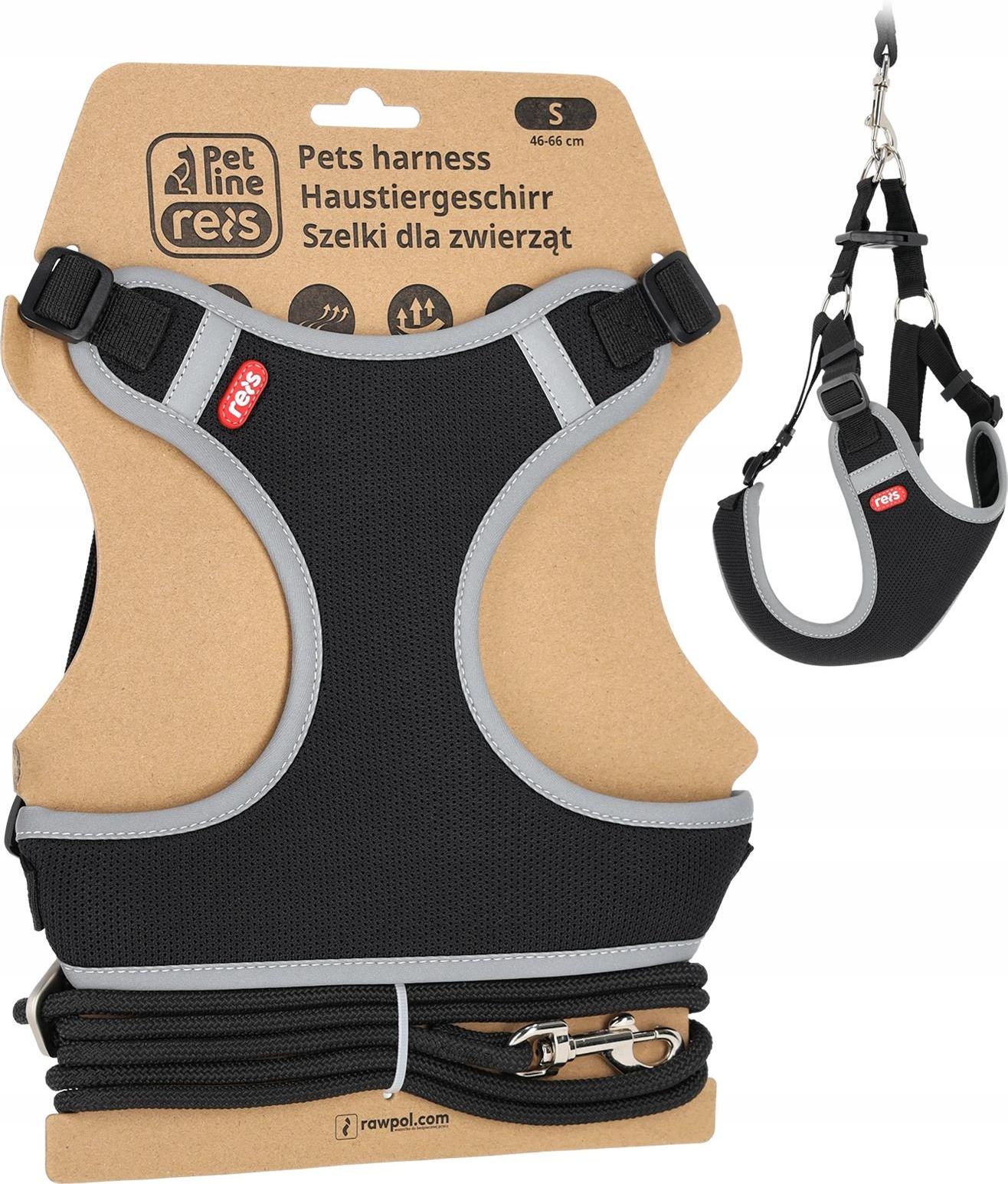 Szelki dla zwierząt Reis PET-HARNESS szelki: dzianina siateczkowa 100% poliester smycz: dzianina 100% poliester polioksymetylenowe klamry żelazne pierścienie haczyk ze stopu cynku możliwość regulacji szelek bezuciskowe odblaskowe elementy idealne na codzienne spacery jak i dłuższe wędrówki Tabela rozmiarów Rozmiar: klatka (cm) 2XS: 32-46 XS: 38-54 S: 46-66 M: 54-78 Geneza symbolu PET-HARNESS PET - ang.pet - zwierzak HARNESS - ang.harness - uprząż Produkt polecany dla branż idealne na codzienne spacery jak i dłuższe wędrówki