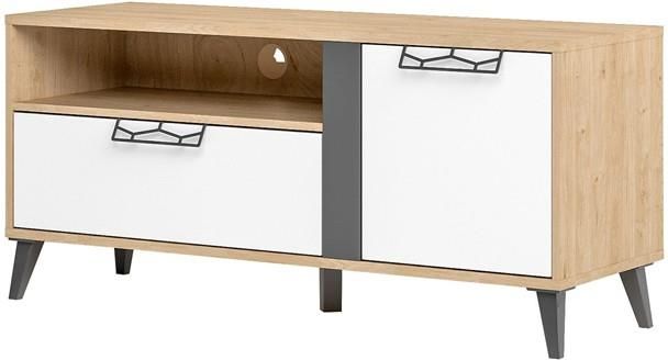 Szafka RTV z kolekcji Moet to stylowy mebel, który doskonale dopełni kącik telewizyjny w Twoim salonie. Mebel łączy w sobie elementy stylu skandynawskiego i nowoczesnego tworząc ciekawą i przytulną aranżację każdego wnętrza. Szafka zachwyca uniwersalną kolorystyką matowej bieli i orzecha amerykańskiego jackson w połączeniu z grafitowymi listwami i metalowymi, ozdobnymi uchwytami rozjaśnią każde wnętrze nadając mu lekkości i wyjątkowego stylu. Szafka zawiera pojemną szufladę, zamykaną szafkę oraz wnękę. Całość wieńczy przestronny blat. Atutem są otwory na kable. Skandynawska forma mebla oparta na wysokich drewnianych nogach kryje w sobie prostotę, staranność wykonania i wysoką trwałość. Cechy charakterystystyczne szafka RTV z szufladą elementy stylu skandynawskiego i nowoczesnego uniwersalna kolorystyka skandynawska forma Wykonanie Wykonanie front płyta meblowa mdf opłaszczowana folią pvc Wykonanie korpus płyta meblowa foliowana w dekorze drewnopodobnym Uchwyt ażurowy wykonany z metalu w kolorze szary mat Wybarwienie Kolorystyka orzech amerykański jackson / biały mat / grafitowy mat Szczegółowe informacje o produkcie Szerokość 120 cm Wysokość 55 cm Głębokość 42 cm