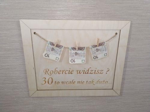Drewniana ramka ze sklejki z wygrawerowanym napisem dla Jubilata Tabliczka w całości wykonana jest z drewna, wysokiej jakości sklejki. Napisy laserowo wypalane w drewnie. W zestaw wchodzą 3 drewniane klamerki i sznurek jutowy. Wymiary: Wysokość: 35 cm Szerokość: 38 cm Grubość : 6 mm W polu (tekst) proszę podać jakie imię i ile lat.