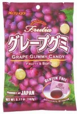 Japońskei Żelki Grape Kasugai Wspaniałe, mega soczyste żelki o smaku czerwonych winogron od znanej, japońskiej firmy Kasugai. Każdy z nich jest w kształcie serduszka i oddzielnie pakowany, dzięki czemu po otworzeniu paczki utrzymują świeżość. Żelki nie zawierają glutenu. Skład Żelków Kasugai Grape Syrop glukozowy, cukier, skoncentrowany sok winogronowy, sorbitol, żelatyna, regulator kwasowości (kwas cytrynowy), aromaty, substancja zagęszczająca (pektyna), skrobia ziemniaczana w proszku, substancja glazurująca (wosk carnauba), emulgatory (estry kwasów tłuszczowych i poliglicerolu, enzym -modyfikowana lecytyna z ziaren soi).