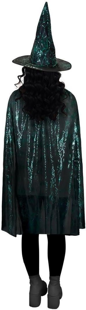 Zestaw czarownika - peleryna + kapelusz Zawartość zestawu: 1 peleryna + 1 kapelusz Wymiary: peleryna 112 cm, kapelusz 37 33 cm Zestaw czarownika to idealna propozycja na Halloween, bal przebierańców, imprezy tematyczne lub spektakle. Składa się z długiej peleryny oraz klasycznego kapelusza z szerokim rondem, oba elementy wykonane z czarnego, lekko transparentnego materiału ozdobionego metaliczno-brokatowym nadrukiem pajęczyn i pająków w kolorze zielonym z efektem połysku. Charakterystyka produktu: Motyw: pajęczyny i pająki w metalicznym nadruku (zielony połysk). Peleryna: lekka, wiązana pod szyją, długość 112 cm. Kapelusz: stożkowy, z usztywnianym rondem - 37 33 cm. Rozmiar uniwersalny: odpowiedni dla młodzieży i dorosłych. Tkanina: poliester z metalicznym nadrukiem. Zastosowanie: Halloweenowe przebrania czarodzieja lub czarownicy. Imprezy andrzejkowe. Szkolne przedstawienia i bale tematyczne. Imprezy karnawałowe i sesje zdjęciowe. - Dekoracja - do ustawienia lub powieszenia jako ozdoba.