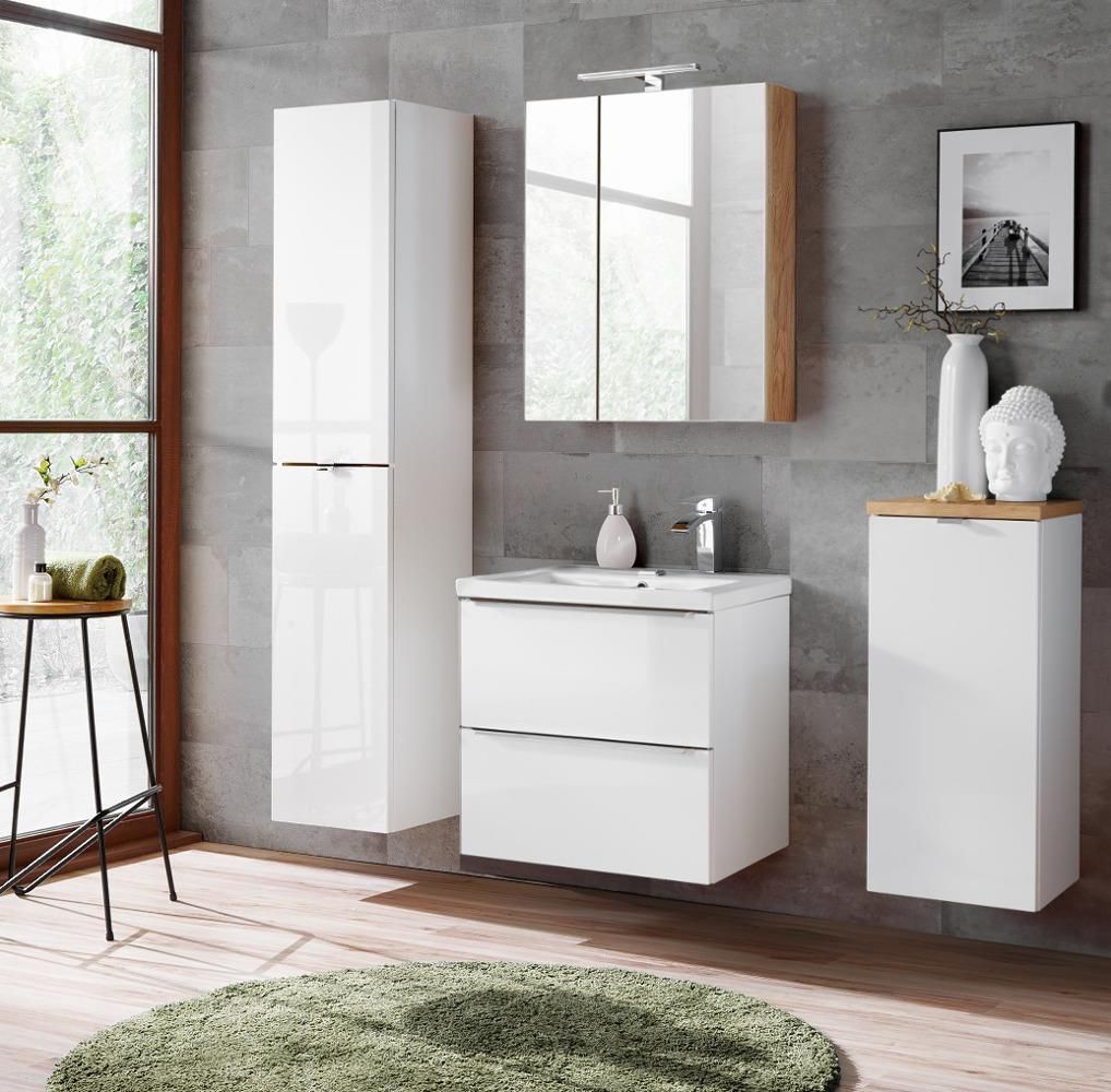 Zestaw białych mebli łazienkowych 60 cm Materiał korpusu:płyta MDF laminnowana Kolor korpusu:Biały połysk Zestaw składa się z:Szafki pod umywalkę 60 cm , Umywalki CFP E-8070-60 , Słupka wysokiego , Szafki niskiej z koszem na pranie , Szafki z lustrem , Lampki LED Kod produktu:Zestaw 60 cm Capri …