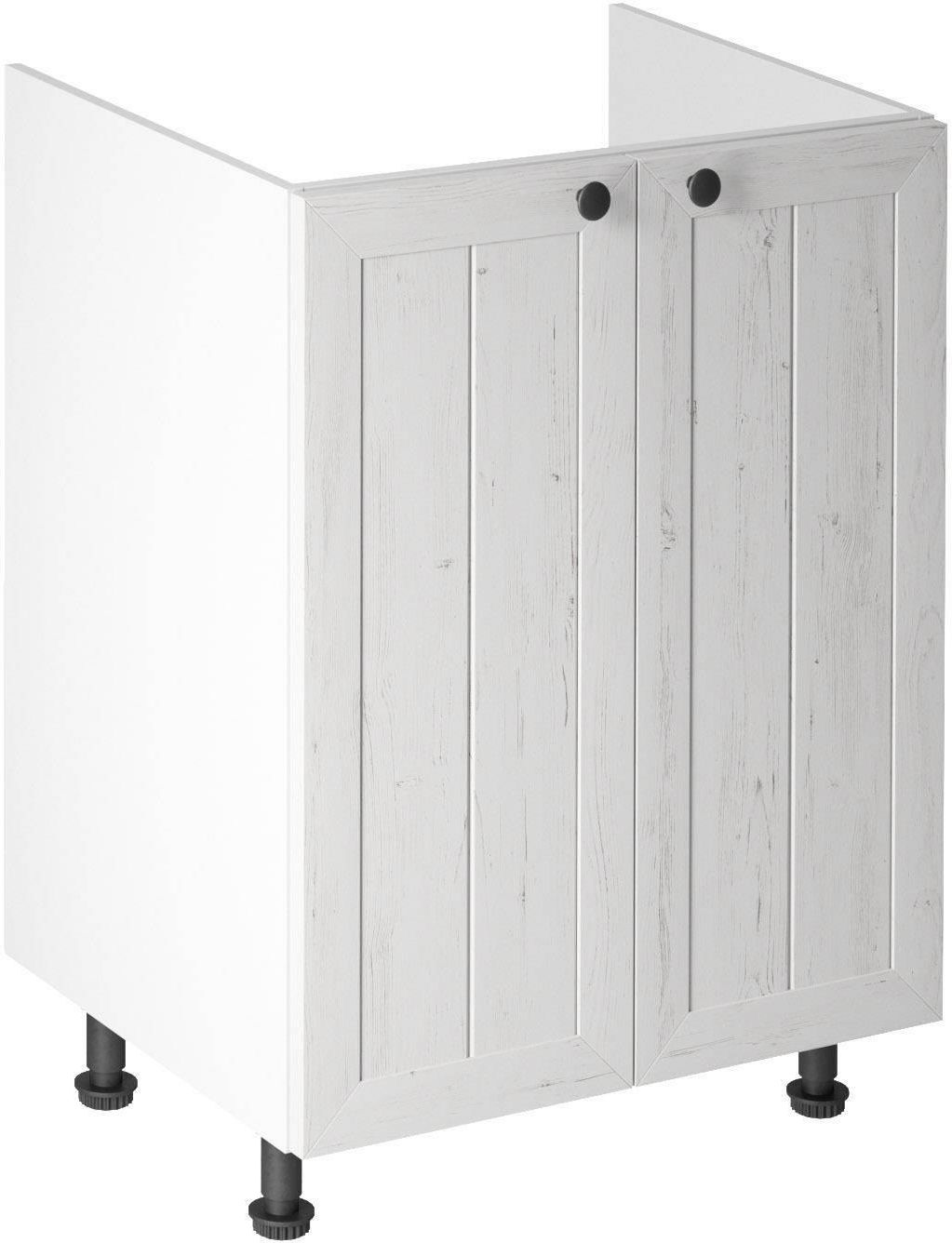 Szafka Kuchenna Dolna 2-drzwiowa Zabudowa Zlewozmywaka Prowansja D60Z Biała posiada nóżki regulowane, zawiasy z samodociągiem, uchwyty metalowe w kolorze czarnym. Mebel do samodzielnego montażu.
