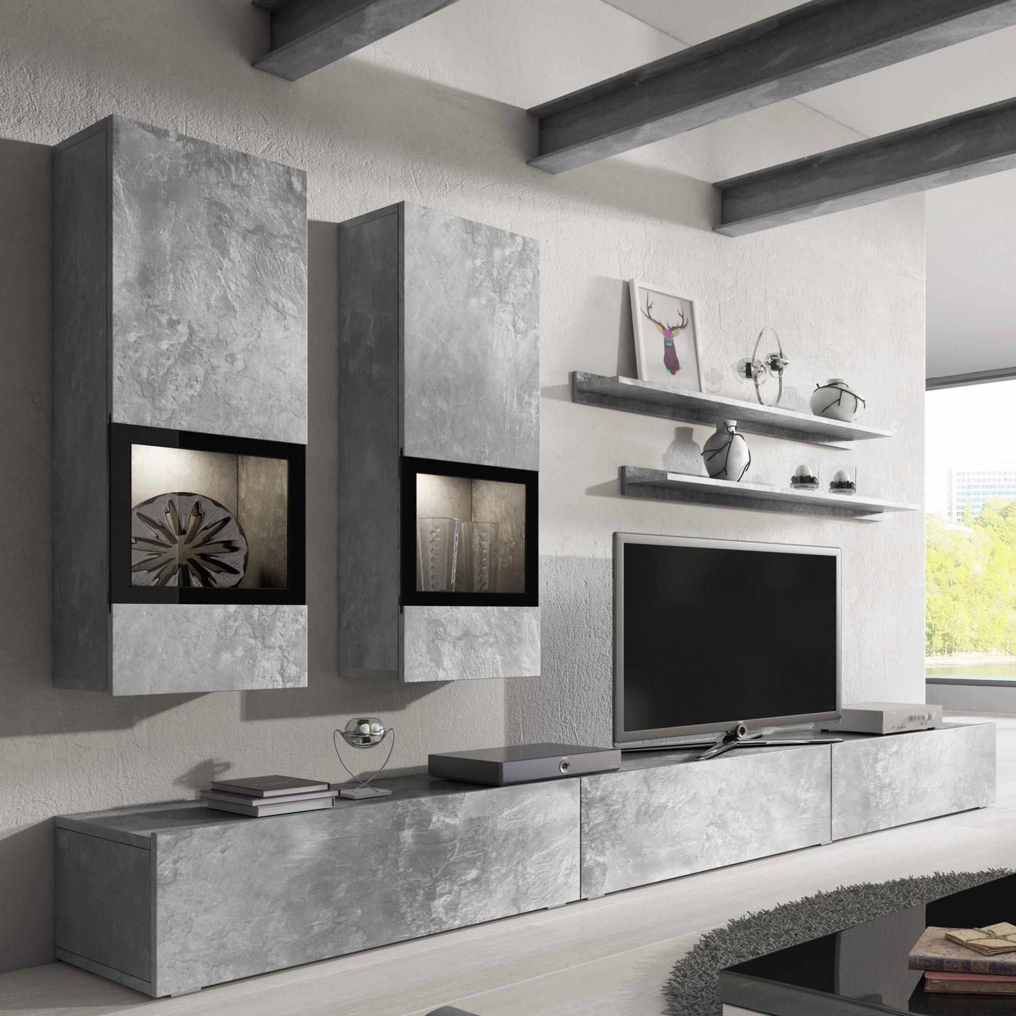 Meblościanka BAROS 24O1BM10 Meblościanka to gotowa aranżacja pokoju dziennego. Zestaw Baros to nowoczesne meble w modnym kolorze jasnego betonu. Całość doskonale uzupełnia wielokolorowe oświetlenie LED. Meblościanka BAROS 24O1BM10 składa się z następujcych elementów: 2 witryny wiszące 2 szafki RTV 2 półki wisząceOświetlenie LED dostępne za dopłatą.