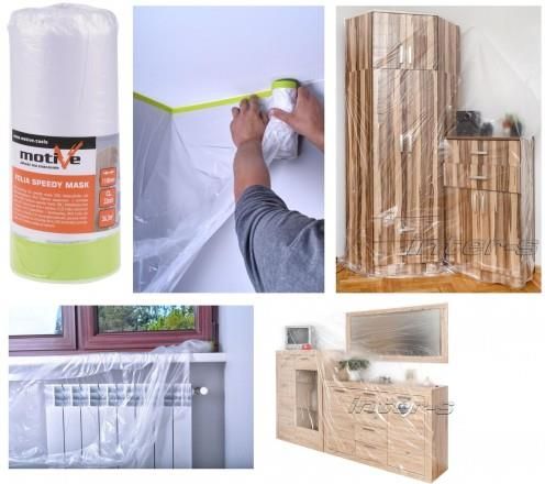 FOLIA SPEEDY MASK 1800/20 MOTIVE Folia SPEEDY MASK to szybki i skuteczny sposób na zabezpieczenie ścian, okien, listew przypodłogowych oraz mebli podczas prac malarsko-remontowych. Cienka folia uzbrojona w taśmę maskującą, co pozwala na sprawne przygotowanie i ochronę powierzchni przed zabrudzeniem lub uszkodzeniem podczas wielu prac. NAKLEJASZ, ROZKŁADASZ I MASZ ZABEZPIECZONE! Cienka folia przylega do powierzchni na zasadzie elektrostatyki. Taśma posiada nośnik z klejem niepozostawiającym śladów przy ściąganiu taśmy. Parametry techniczne: Grubość: 9 mikronów Szerokość taśmy: 25mm Powierzchnia folii: 9,3m2 Szerokość folii: 0,3m