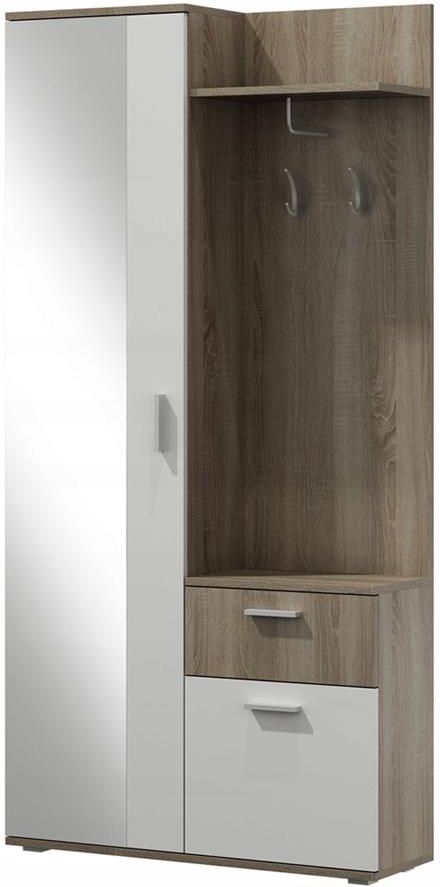 Nowoczesna garderoba do przedpokoju z lustrem LUX sonoma/biały, polskiego producenta JARSTOL. Elegancka i funkcjonalna. Wykonana z laminowanej płyty meblowej w kolorze dąb sonoma z dodatkiem bieli. Garderoba posiada po prawej stronie 3 wieszaki, szufladę oraz małą szafkę zamykaną drzwiczkami. Po lewej stronie znajduje się szafa do wieszania ubrań oraz dwie półki. Całość zamykana drzwiami z lustrem. Garderoba posiada uniwersalny system montażu (możliwość umieszczenia części z lustrem po prawej stronie). DANE TECHNICZNE: Wymiary: 195 x 97 x 30 cm (wys./szer./gł.) Materiał: laminowana płyta meblowa, płyta HDF, okleina ABS, metal, szkło, Rozwiązania: 2 półki + szafa z wieszakiem(lewa strona), 1 półka, 3 wieszaki, szuflada z szafką(prawa strona) Kolor: dąb sonoma/biały Gwarancja: 2 lata Produkt do samodzielnego montażu * Ze względu na różne ustawienia urządzeń elektronicznych na których oglądamy produkty, odcień kolorystyczny może się delikatnie różnić.