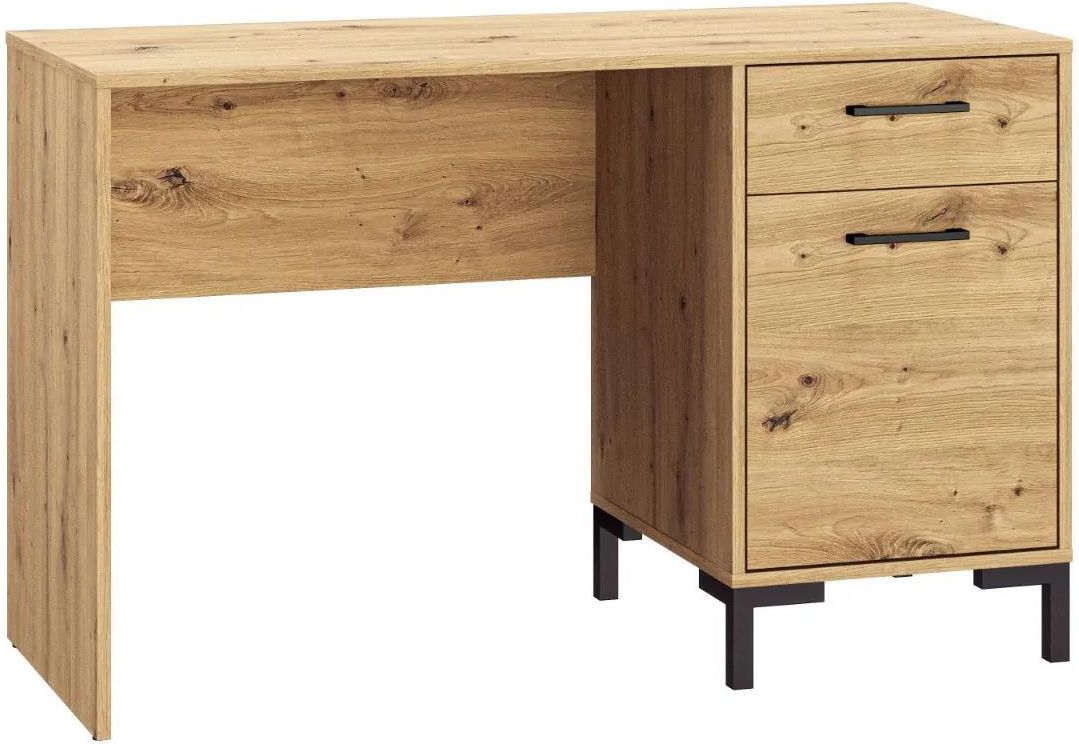 Młodzieżowe biurko NIKOLA w stylu loft Biurko NIKOLA to produkt polski będący jednym z elementów kolekcji mebli przeznaczonych do salonu, sypialni, czy też pokoju młodzieżowego. Biurko doskonale sprawdzi się w pokoju nastolatka, jako wygodne miejsce do odrobienia lekcji, czy nauki, a w pokoju osoby dorosłej zapewni miejsce do pracy. Biurko wykonane jest z wysokiej jakości płyty laminowanej w ciepłym kolorze dąb artisan, a jej krawędzie zabezpieczone są obrzeżami ABS. Tak wykończone biurko cechuje się dużą odpornością na uszkodzenia mechaniczne tj. zadrapania, odpryski, wysoką temperaturę oraz wilgoć. Dzięki wykończeniu z najwyższą dbałością o detale biurko jest solidne i prezentuje się atrakcyjnie. Uchwyty oraz nóżki biurka wykonane są z czarnego tworzywa sztucznego, które w połączeniu z płytą o barwie dąb artisan tworzą ciekawą kompozycję pasującą do wnętrz w stylu loft. Biurko NIKOLA posiada wbudowany kontenerek z jedną szufladą i szafką z półką wewnątrz. Dzięki obu tym elementom możliwe jest przechowywanie dokumentów, zeszytów, materiałów piśmienniczych oraz innych przedmiotów. Blat biurka jest na tyle duży, że bez problemu zmieści się na nim laptop, czy też monitor z klawiaturą i myszką od komputera stacjonarnego. Cechy produktuprodukt polski,prostokątna ława do salonu w stylu loft,konstrukcja z płyty laminowanej o grubości 16 mm,obrzeża oklejone ABS 1 mm,nóżki o wysokości 12 cm z czarnego tworzywa, pojemna szuflada na prowadnicach kulkowy