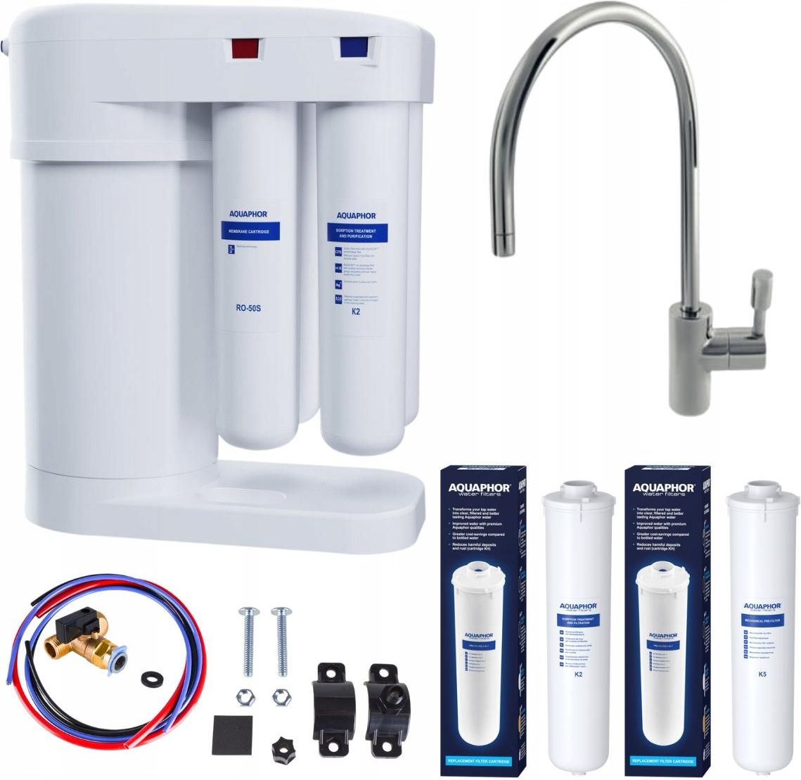 WYDAJNY SYSTEM ODWRÓCONEJ OSMOZY MORION RO-101S z dodatkowymi filtrami K2 i K5 w zestawie promocyjnym. RO-101S Morion to kompaktowy system odwróconej osmozy z wbudowanym zbiornikiem na wodę. Zajmuje mniej miejsca pod zlewem w porównaniu do filtrów odwróconej osmozy, które posiadają zewnętrzny zbiornik na wodę. Urządzenie Aquaphor Morion to wysoka skuteczność filtracji, prosta obsługa oraz wysoka jakość wody. Urządzenie jest oszczędne, a jego serwis kosztuje mniej niż serwis tradycyjnych filtrów odwróconej osmozy. Filtr ten produkuje smaczną wodę pitną, którą możesz używać zarówno do picia, jak i gotowania kawy, herbaty, zup, przygotowywania posiłków. Urządzenie możesz umieścić w szafce pod zlewem, lub dowolnej szafce w kuchni, z której poprowadzisz elastyczne wężyki w celu podłączenia filtra do kranu na zlewie. Pamiętaj, aby do filtra do wody był dostęp aby co 6 miesięcy, w celu wykonaniu wykonania wymiany wkładów. Wbudowany zbiornik na wodę znacząco zmniejsza ilość miejsca potrzebną na instalację urządzenia. Etapy filtracji wody w Aquaphor RO-101S Morion I etap filtracja sedymentacyjna (wkład K5) II etap wstępne oczyszczanie wody (wkład K2) III etap filtracja membranowa (membrana RO-50S) osmotyczna VI etap wzbogacenie wody w odpowiednie ilości minerałów: magnez i wapń. Dane techniczne Aquaphor Morion Wymiary: 371 x 190 x 420 mm Waga: 6,2 kg Pojemność zbiornika: ∼ 5 litrów Czas napełniania zbiornika: ok. 60 minut Wydajność: ∼ 190 litrów / dobę Stosunek wody przefiltrowanej do drenażowej: 1:5 Min. i maks.ciśnienie wody: 1,9-6,3 atm Temperatura wody: 5-38°C Mineralizacja wody: 0.56 - 1.4 °dH (10-25 ppm) pH wody po membranie osmotycznej: ∼6-7 pH Częstotliwość wymiany wkładów K2 i K5 – co 3-4 m-ce (max 6 miesiecy) K7M – co 12 m-cy RO-50S – co 18-24 m-cy W skład zestawu promocyjnego wchodzą Kompletny system filtracji MORION RO-101S z kranem Dodatkowy filtr K2 z technologią z bloków węglowych Dodatkowy filtr K5 (sedymentacyjny polipropylen)