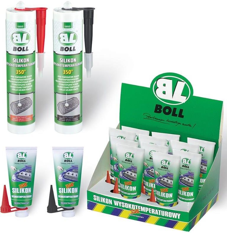 BOLL SILIKON WYSOKOTEMPERATUROWY Producent: BOLL | Pojemność: 290 ml | Kolor: szary Jednoskładnikowa masa silikonowa odporna na temperatury od -40°C do +350°C (przez około 30 minut jednorazowo, o wysokim stopniu elastyczności). ZALETY: bardzo dobra przyczepność do blach, metali, aluminium, szkła i tworzyw sztucznych pełna odporność na działanie kwasów, olejów, smarów, benzyny, wody, promieni UV i czynników atmosferycznych bezoctanowy odporność termiczna: od -40°C do + 250°C (350°C przez 30 min.) W przypadku gdy uszczelniane elementy będą demontowane - w celu niedopuszczenia do ich trwałego połączenia - należy zastosować warstwę wazeliny technicznej. Nr produktu: 00701051 Stosowany w miejscach szczególnie narażonych na działanie wysokich temperatur takich jak silniki samochodowe, kominki, urządzenia grzewcze, piece przemysłowe. Zalecany do uszczelniania elementów silnika. Zastępuje uszczelki motoryzacyjne. W przypadku, gdy uszczelniane elementy będą demontowane – w celu niedopuszczenia do ich trwałego połączenia – należy zastosować warstwę wazeliny technicznej.