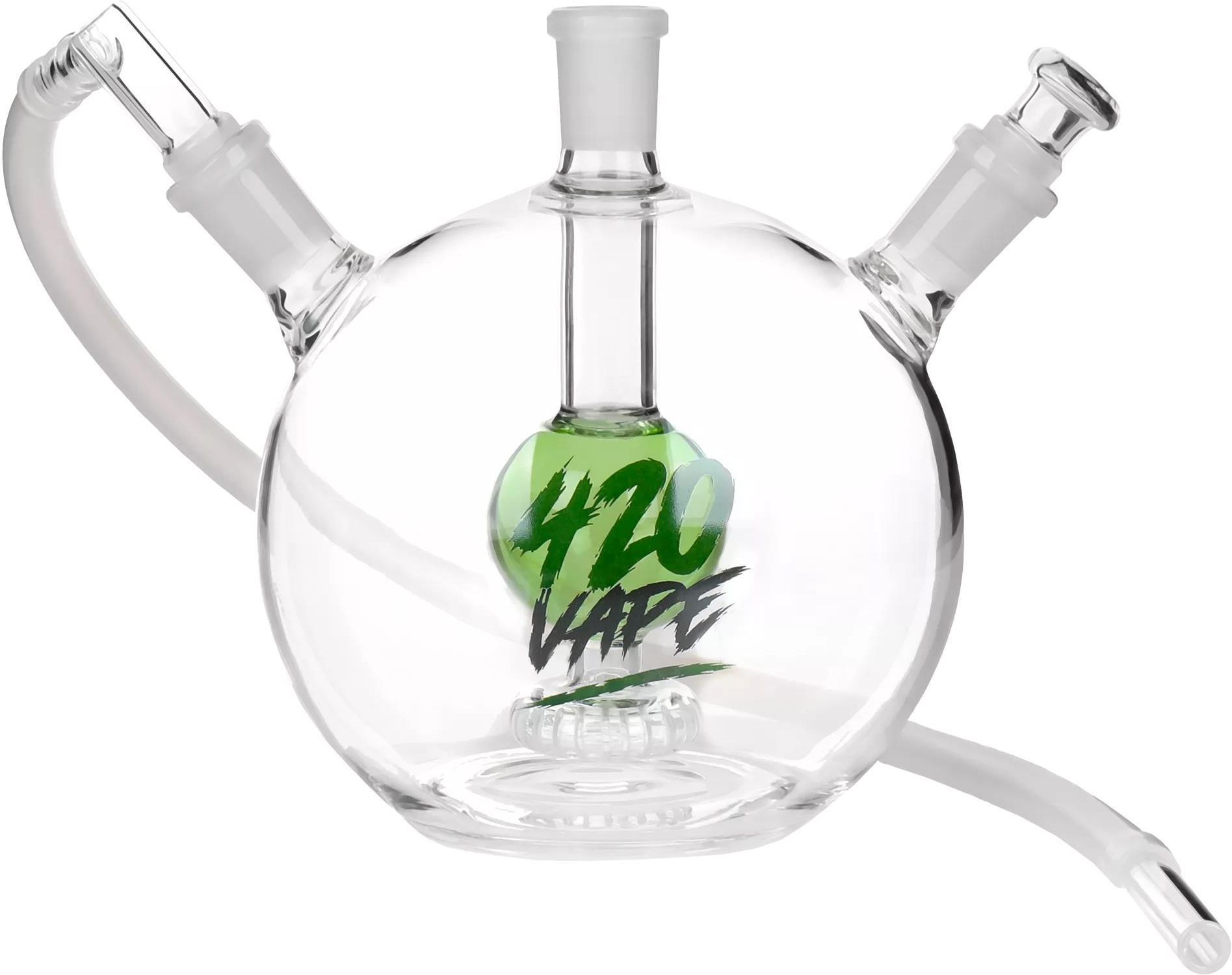 Bomb Globe Turbo XL 420VAPE bongo z paodwójnym ustnikiem szlif 14.5 mm Fajka wodna Bomb Globe Turbo XL 420VAPE do połączenia z waporyzatorem. Wykonana z mocnego borokrzemowego szkła. Zaopatrzona w 2 wejścia na ustniki, które umożliwiają palenie 2 osobom równocześnie. Szlif: 14.5 mm