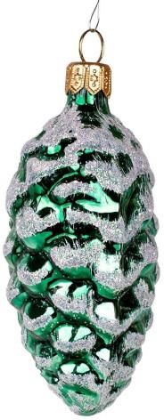 Bombka retro - szyszka zielona Bombka szyszka szroniona to sposób na ozdobienie choinki w stylu retro. Design ten pochodzi z przełomu lat 60 i 70 XX wieku i wyróżnia się dbałością o szczegóły i ponadczasowością. Szklana bombka retro szyszka wykonana została przez polskich rzemieślników techniką wydmuchiwania. Bombka posiada metalowy zaczep. Zdobiona ręcznie. Ze względu na ręczne wykonanie bombki mogą się nieznacznie różnić. Wymiary: wysokość: 9,5 cm