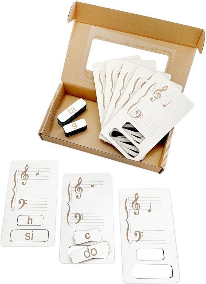 Dziecko przez zabawę uczy się nazwy oraz położenia nut na pięciolinii. Zestaw składa się z 8 drewnianych płytek wielkości 8,5 cm na 14 cm z wygrawerowaną nutą w kluczu wiolinowym. Do każdej płytki dołączone są nazwy literowe nut: C, D, E, F, G, A, H, C i nazwy solmizacyjne: do, re, mi, fa, sol, la, …