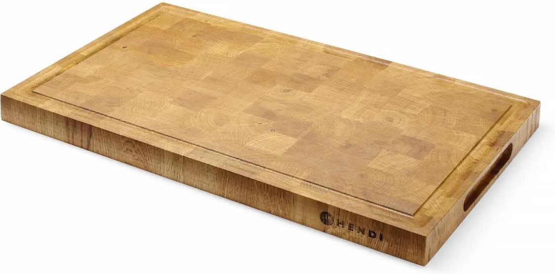 Dwustronna deska dębowa sztorcowa, nr kat. 505441, wymiary: 530 x 325 x 35 mm , z uchwytami i żłobieniem, Hendi. Cechy produktu: Dwustronna deska dębowa wykonana z dębowych kawałków drewna, przeznaczona do serwowania i prezentacji potraw. Wykonana metodą sztorcową, tzw. end-grain: kwadratowe elementy z drewna dębowego są sklejone ze sobą we wzorze szachownicy, a włókna drewna ułożone pionowo, prostopadle do powierzchni roboczej, zwiększają wytrzymałość i odporność na zarysowania oraz zapobieganie tępieniu się noży, gdyż ostrze układa się między włóknami drewna. W desce wykonano frezowane uchwyty- podcięcia, aby używanie było praktyczne i najbardziej poręczne, a także charakterystyczne żłobienia po jednej stronie deski. Deska Hendi to naturalny wyrób jakości premium, bardzo wytrzymały, Każda deska jest częściowo wykonana przez profesjonalne maszyny stolarskie, a częściowo wykonana ręcznie przez doświadczonych rzemieślników. Jej masywność, solidność i dobre wrażenie wizualne sprawiają, że jest idealna do eleganckiego prezentowania przekąsek, serów, kanapek, krojonych owoców czy mięs. Dane techniczne: Marka: Hendi Materiał: drewno dębowe Wysokość mm: 35 Długość mm: 530 Szerokość mm: 325