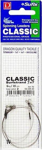 Przypon spinningowy Dragon Surfstrand Classic wykonany zostały ze stalowej plecionki o 49 włóknach. Ta wyjątkowo mocna, w stosunku do swojej średnicy, linka nie została pokryta teflonem. Dlatego też jest miękka i nie wpływa negatywnie na pracę przynęty.
