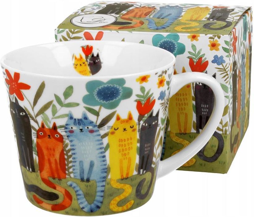Duży kubek, kubas prosty zdobiony wzorem kotów z seriiKoci świat Koty ogrodowe wchodzący w skład kolekcji Animals - Koty, charakteryzuje się naturalnym kremowo-białym kolorem z delikatnym połyskiem oraz wyjątkową wytrzymałością i trwałością, zachowując lekkość i finezję. Pojemność kubka 600 ml (pojemność liczona po rant kubka). Dzięki sporej pojemności kubka możemy dłużej delektować się naszym ulubionym napojem. Kolekcja zdobiona motywem wielokolorowych, puszystych domowych kotów siedzących na kwiecistej łące. Całość utrzymana w filuternej stylistyce oraz żywych i wyrazistych kolorach.Mocna, przejrzysta barwa dodają temu wzorowi jeszcze większego uroku. Wygodny w użytkowaniu i prosty w utrzymaniu czystości. Kubek można swobodnie myć w zmywarce oraz używać w kuchence mikrofalowej, co ułatwi codzienne użytkowanie i zaoszczędzi nasz cenny czas. Całość zapakowana w ozdobne pudełko dekorowane tym samym motywem to doskonały pomysł na niebanalny prezent urodzinowy zarówno dla kobiety i mężczyzny, a także podarunek dla szefa czy nauczyciela, również jako podziękowanie. Wzór:Koci świat Koty ogrodowe Produkt 1 x kubek 1 x prezentowe pudełko Wymiary pojemność całkowita kubka 600 ml pojemność użytkowa kubka około 550 ml średnica 11,4 cm wysokość 9,5 cm wymiary pudełka 12,8 cm x 12,8 cm x 10 cm h. Materiał porcelana Użytkowanie dopuszczone do kontaktu z żywnością do zmywarki do mikrofali
