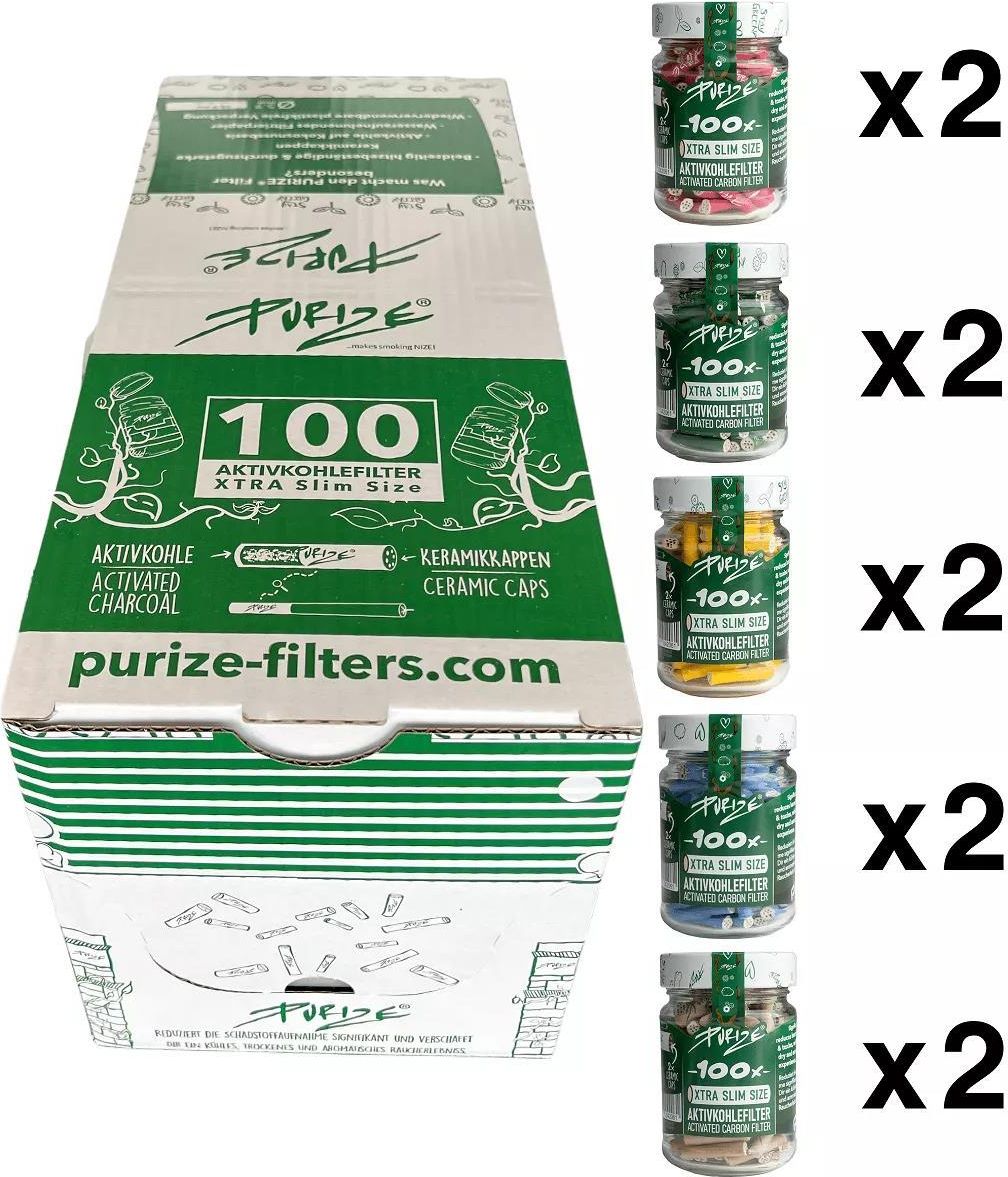 Filtry węglowe Purize XTRA Slim BOX 10 x 100 szt. Mix kolorów Filterki do jointów z aktywnym węglem na bazie orzecha kokosowego- Purize XTRA Slim. Opakowanie zbiorcze - Box - 10 x szklany słoik 100 szt. Miks kolorów: 2 x różowe, 2 x zielone, 2 x żółte, 2 x niebieskie, 2 x organic.
