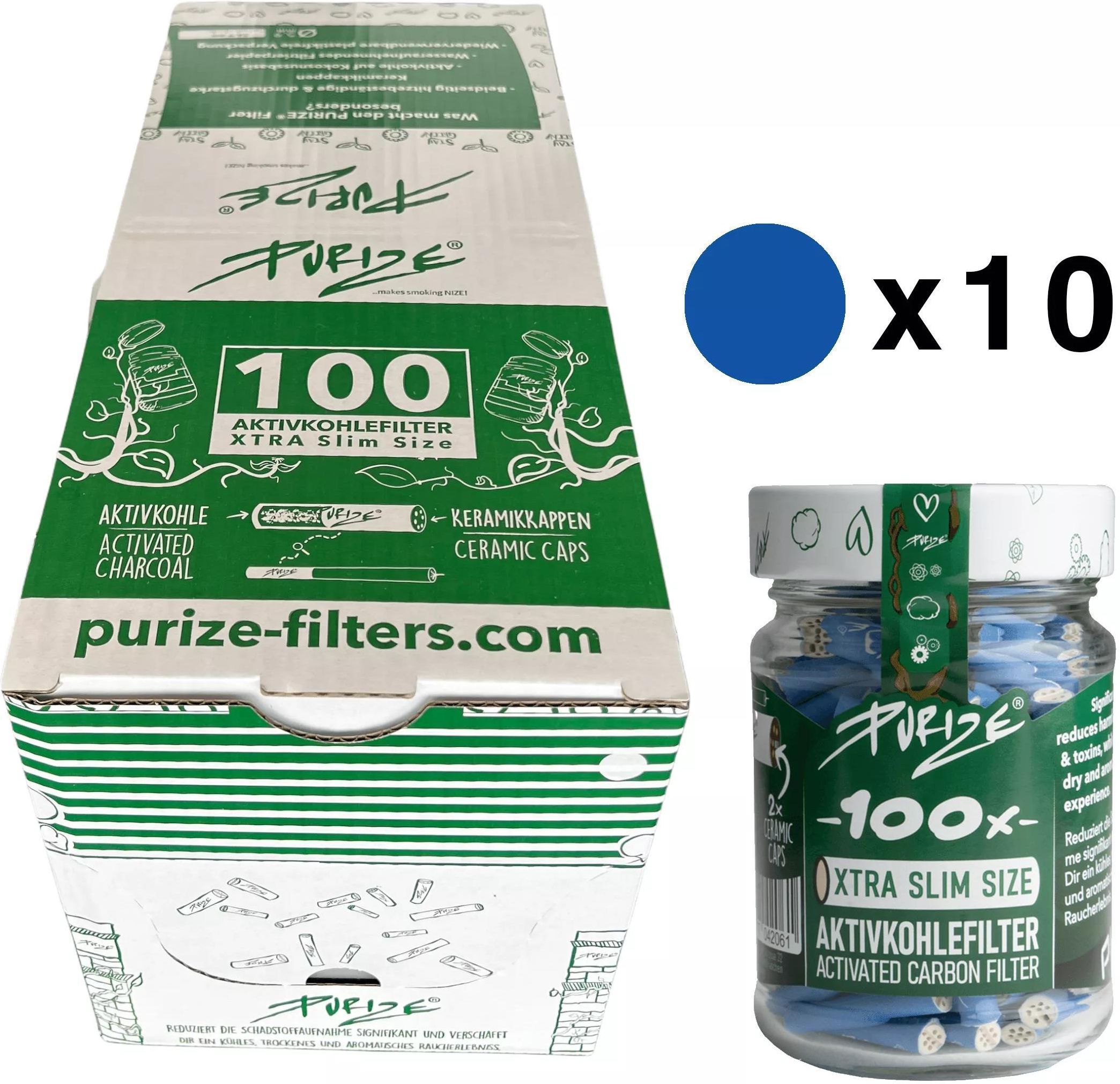 Filtry węglowe Purize XTRA Slim BOX 10 x 100 szt. NIEBIESKIE Filtry do jointów z aktywnym węglem Purize XTRA Slim Blue. Opakowanie zbiorcze Box - 10 x szklany słoik 100 szt. Filtry Purize ograniczaja ilość substancji smolistych przedostających się do płuc i podkreślają smak suszu. Zaopatrzone są w oryginalne, ceramiczne zaślepki umieszczone z obu stron filtra.