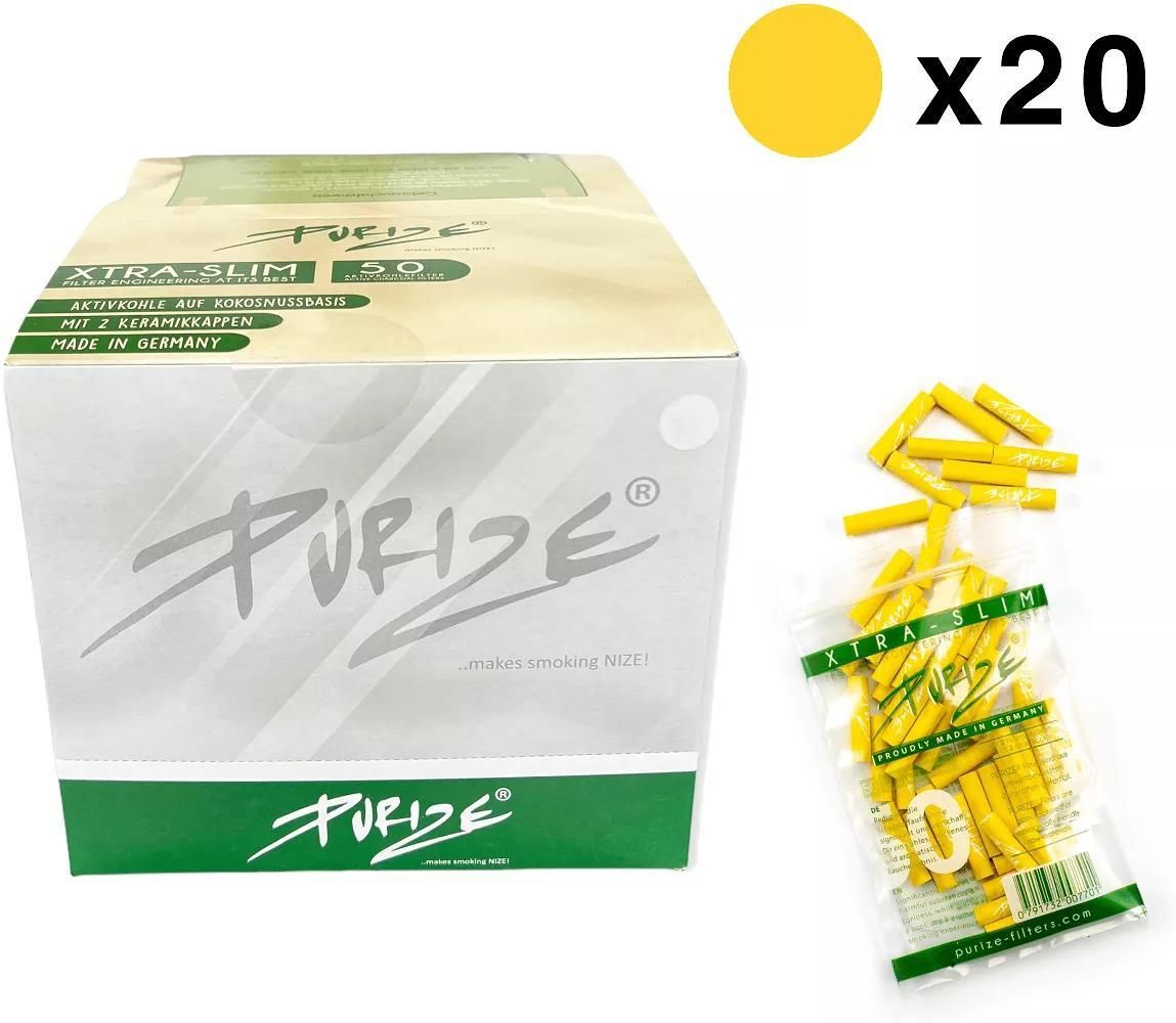 Filtry węglowe Purize XTRA Slim BOX 20 x 50 szt. ŻÓŁTE Filterki do jointów z aktywnym węglem na bazie orzecha kokosowego- Purize XTRA Slim Yellow. Opakowanie zbiorcze - Box - 20 x 50 szt. w woreczku strunowym. Filtry Purize ograniczaja ilość substancji smolistych przedostających się do płuc i podkreślają smak palonej mieszanki. Zaopatrzone są w oryginalne, ceramiczne zaślepki umieszczone z obu stron filtra.