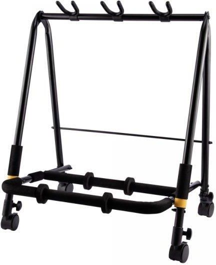 Profesjonalny, składany statyw sceniczny typu RACK na trzy gitary elektryczne, basowe lub akustyczne. Ruchome uchwyty na szyjki instrumentów posiadają dodatkowo miejsce na piórka gitarowe. Podstawa pod gitary pokryta najwyższej jakości pianką. Łatwa zmiana konfiguracji na mobilną lub stacjonarną: Obracanie i przesuwanie bez wysiłku na kółkach lub wymiana na gumowe nóżki do użytku w stałej lokalizacji. Dodatkowo istnieje możliwość rozbudowania statywu na większą ilość miejsc na gitarę dzięki dokupieniu dodatkowych uchwytów Hercules HA 205 (3szt są w kpl ze statywem). Waga: 4.3 kg. Maksymalne obciążenie do 80 kg. Wysokość: 715 mm (28.1”). Wymiary podstawy: 670 mm x 550 mm (26.38" x 21.65”). Wymiary po złożeniu: 630 mm x 110 mm x 710 mm (24.8" x 4.33” x 27.95")....